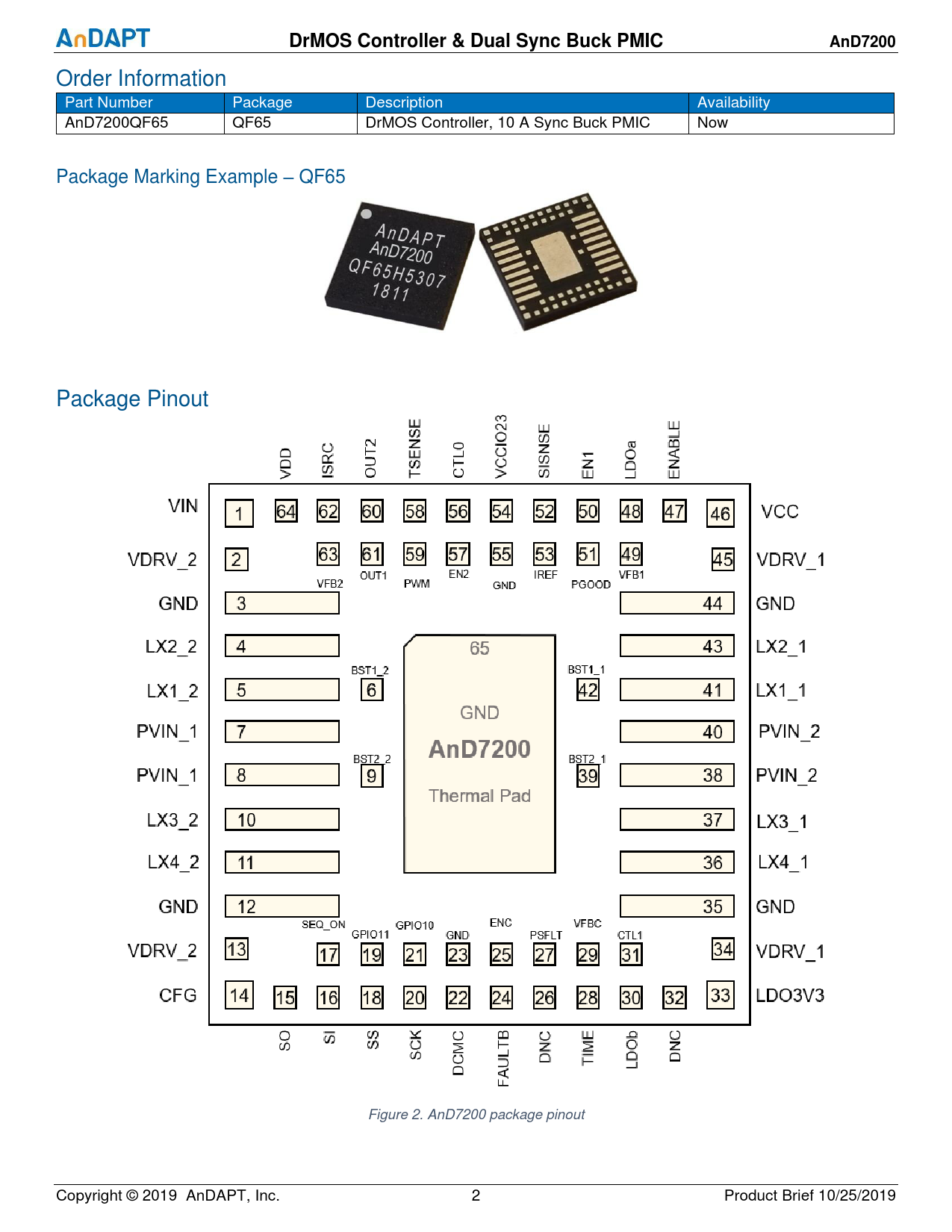 Order Information Part Number Package Description Availability AnD7200QF65 QF65 DrMOS Controller, 10 A Sync Buck PMIC Now Package Marking Example – QF65 Package Pinout Figure 2. AnD7200 package pinout Copyright © 2019 AnDAPT, Inc. 2 Product Brief 10/25/2019
