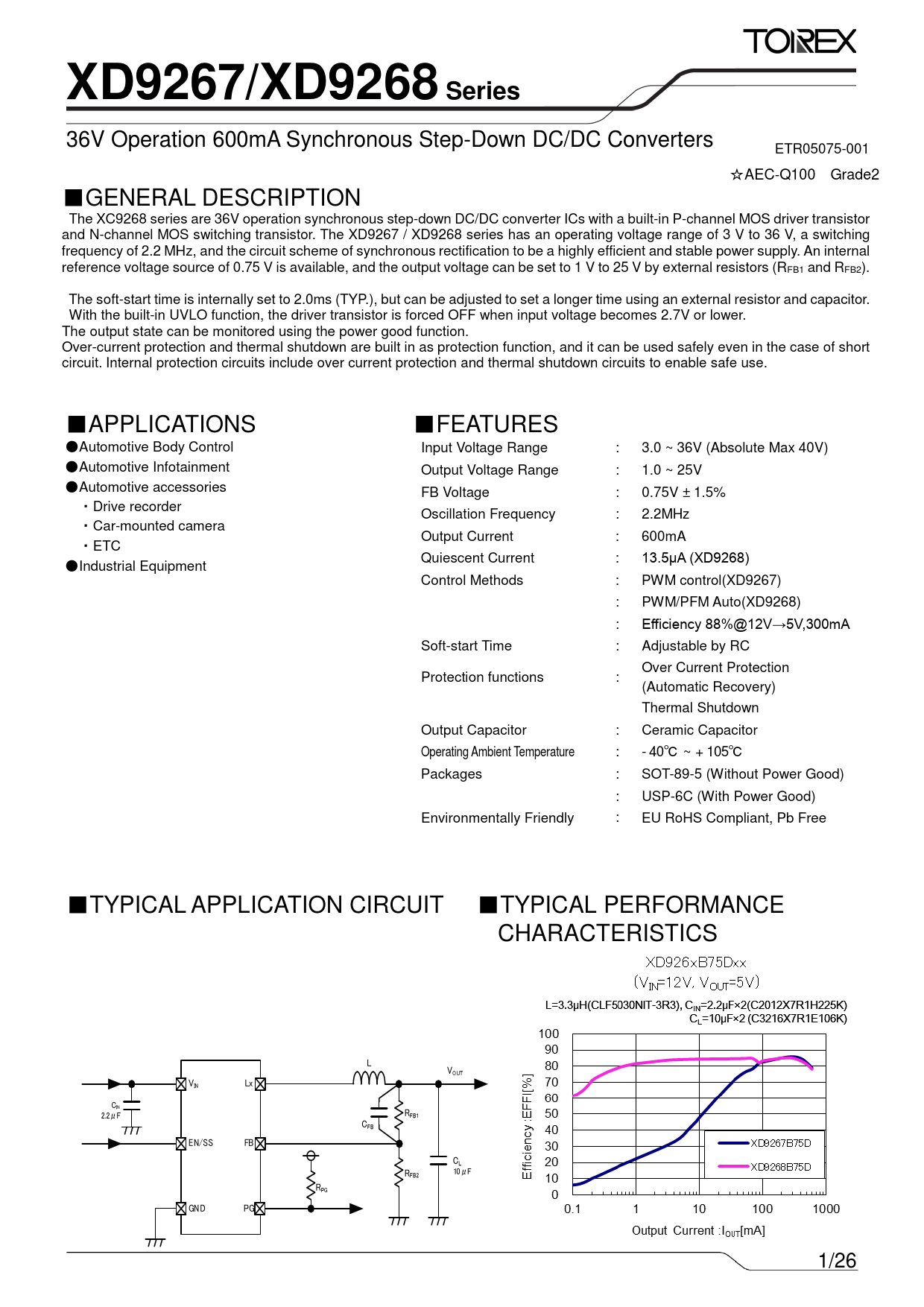 3 6V Operation 600mA Synchronous Step-Down DC/DC Converters ETR05075-001 ☆AEC-Q100 Gr ade2 ■GENERAL DESCRIPTION The XC9268 series are 36V operation synchronous step-down DC/DC converter ICs with a built-in P-channel MOS driver transistor and N-channel MOS switching transistor. The XD9267 / XD9268 series has an operating voltage range of 3 V to 36 V, a switching f requency of 2.2 MHz, and the circuit scheme of synchronous rectification to be a highly efficient and stable power supply. An internal reference voltage source of 0.75 V is available, and the output voltage can be set to 1 V to 25 V by external resistors (RFB1 and RFB2). The soft-start time is internally set to 2.0ms (TYP.), but can be adjusted to set a longer time using an external resistor and capacitor. With the built-in UVLO function, the driver transistor is forced OFF when input voltage becomes 2.7V or lower. The output state can be monitored using the power good function. Over-current protection and thermal shutdown are built in as protection function, and it can be used safely even in the case of short circuit. Internal protection circuits include over current protection and thermal shutdown circuits to enable safe use. ■APPLICATIONS ■FEATURES ● Automotive Body Control Input Voltage Range : 3.0 ~ 36V (Absolute Max 40V) ●Automotive Infotainment Output Voltage Range : 1.0 ~ 25V ● Automotive accessories FB Voltage : 0.75V ± 1.5% ・ Drive recorder Oscillation Frequency : 2.2MHz ・Car-mounted camera Output Current : 600mA ・ETC Quiescent Current : 13.5μA (XD9268) ●Industrial Equipment Control Methods : PWM control(XD9267) : PWM/PFM Auto(XD9268) : Efficiency 88%@12V→5V,300mA Soft-start Time : Adjustable by RC Over Current Protection Protection functions : (Automatic Recovery) Thermal Shutdown Output Capacitor : Ceramic Capacitor Operating Ambient Temperature : - 40℃ ~ + 105℃ Packages : SOT-89-5 (Without Power Good) : USP-6C (With Power Good) Environmentally Friendly : EU RoHS Compliant, Pb Free ■TYPICAL APPLICATION CIRCUIT ■TYPICAL PERFORMANCE CHARACTERISTICS L VOUT VIN Lx CIN 2.2μF RFB1 CFB EN/SS FB CL R 10μF FB2 RPG GND PG 1/26