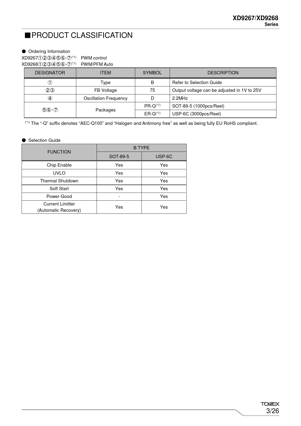 ■PRODUCT CLASSIFICATION ● Ordering Information XD9267①②③④⑤⑥-⑦(*1) PWM control XD9268①②③④⑤⑥-⑦(*1) PWM/PFM Auto DESIGNATOR ITEM SYMBOL DESCRIPTION ① Type B Refer to Selection Guide ②③ FB Voltage 75 Output voltage can be adjusted in 1V to 25V ④ Oscillation Frequency D 2.2MHz PR-Q(*1) SOT-89-5 (1000pcs/Reel) ⑤⑥-⑦ Packages ER-Q(*1) USP-6C (3000pcs/Reel) (*1) The “-Q” suffix denotes “AEC-Q100” and “Halogen and Antimony free” as well as being fully EU RoHS compliant. ● Selection Guide B TYPE FUNCTION SOT-89-5 USP-6C Chip Enable Yes Yes UVLO Yes Yes Thermal Shutdown Yes Yes Soft Start Yes Yes Power-Good - Yes Current Limitter Yes Yes (Automatic Recovery) 3/26