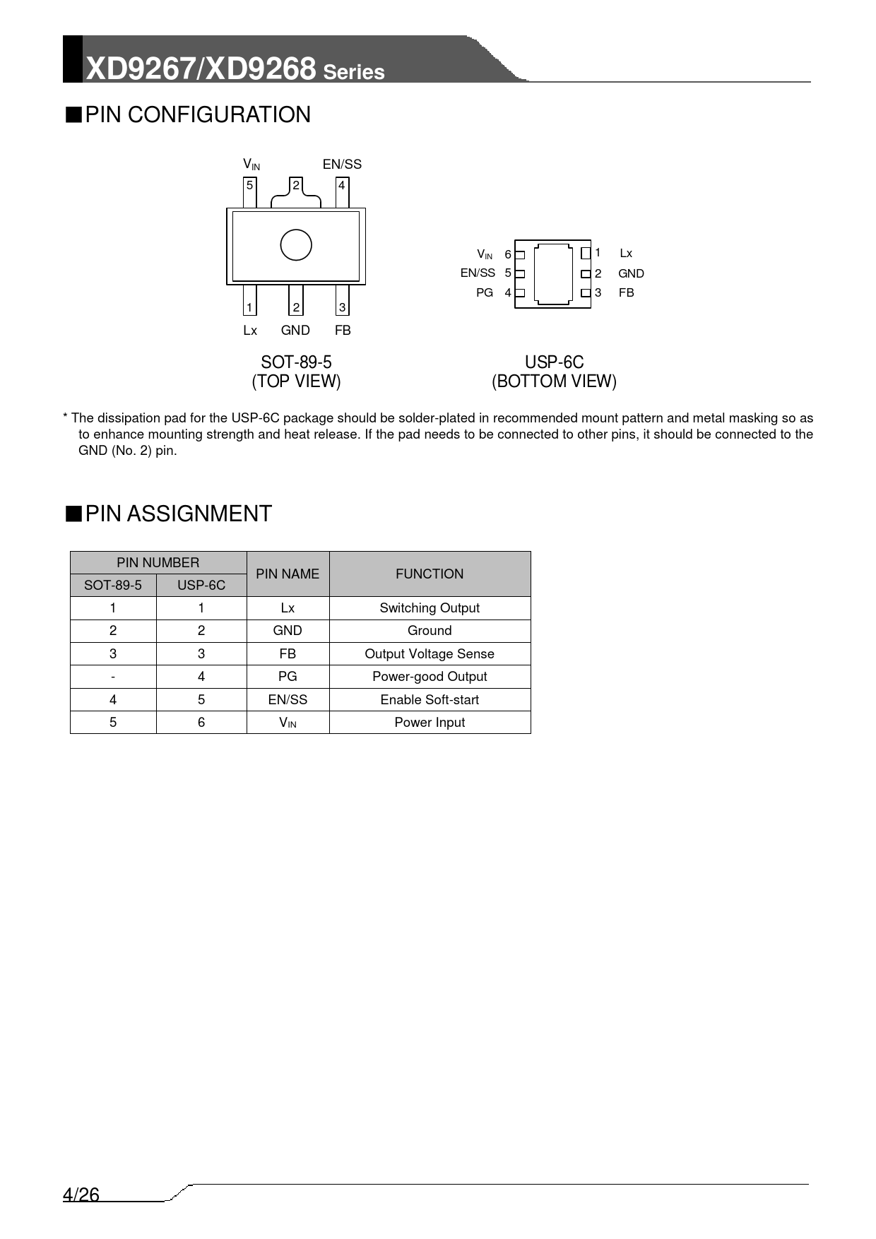 ■PIN CONFIGURATION VIN EN/SS 5 2 4 VIN 6 1 Lx EN/SS 5 2 GND PG 4 3 FB 1 2 3 Lx GND FB SOT-89-5 USP-6C (TOP VIEW) (BOTTOM VIEW) * The dissipation pad for the USP-6C package should be solder-plated in recommended mount pattern and metal masking so as to enhance mounting strength and heat release. If the pad needs to be connected to other pins, it should be connected to the GND (No. 2) pin. ■PIN ASSIGNMENT PIN NUMBER PIN NAME FUNCTION SOT-89-5 USP-6C 1 1 Lx Switching Output 2 2 GND Ground 3 3 FB Output Voltage Sense - 4 PG Power-good Output 4 5 EN/SS Enable Soft-start 5 6 VIN Power Input 4/26