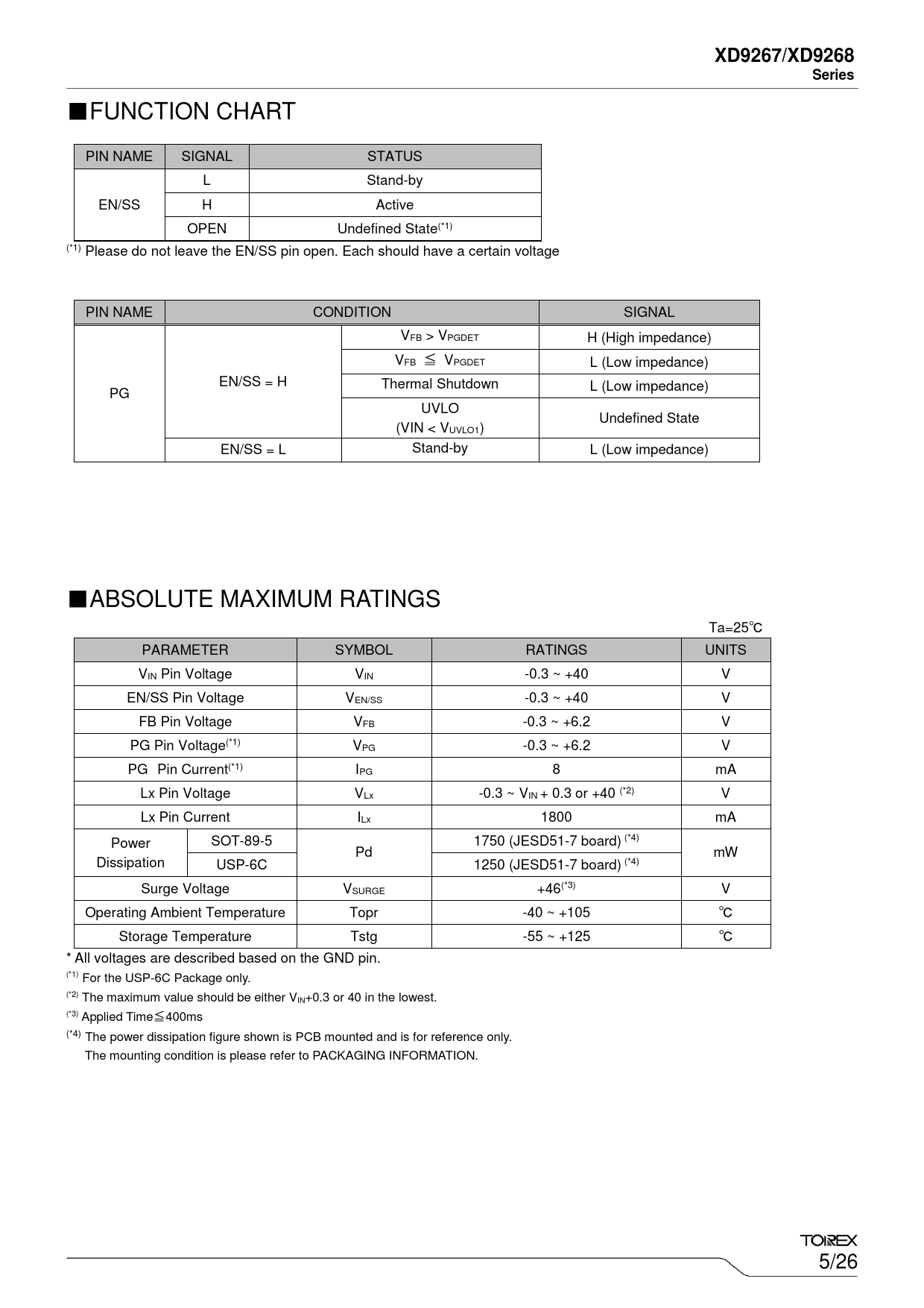 ■FUNCTION CHART PIN NAME SIGNAL STATUS L Stand-by EN/SS H Active OPEN Undefined State(*1) (*1) Please do not leave the EN/SS pin open. Each should have a certain voltage PIN NAME CONDITION SIGNAL VFB > VPGDET H (High impedance) VFB ≦ VPGDET L (Low impedance) EN/SS = H Thermal Shutdown L (Low impedance) PG UVLO Undefined State (VIN < VUVLO1) EN/SS = L Stand-by L (Low impedance) ■ABSOLUTE MAXIMUM RATINGS Ta=25℃ PARAMETER SYMBOL RATINGS UNITS VIN Pin Voltage VIN -0.3 ~ +40 V EN/SS Pin Voltage VEN/SS -0.3 ~ +40 V FB Pin Voltage VFB -0.3 ~ +6.2 V PG Pin Voltage(*1) VPG -0.3 ~ +6.2 V PG Pin Current(*1) IPG 8 mA Lx Pin Voltage VLx -0.3 ~ VIN + 0.3 or +40 (*2) V Lx Pin Current ILx 1800 mA Power SOT-89-5 1750 (JESD51-7 board) (*4) Pd mW Dissipation USP-6C 1250 (JESD51-7 board) (*4) Surge Voltage VSURGE +46(*3) V Operating Ambient Temperature Topr -40 ~ +105 ℃ Storage Temperature Tstg -55 ~ +125 ℃ * All voltages are described based on the GND pin. (*1) For the USP-6C Package only. (*2) The maximum value should be either VIN+0.3 or 40 in the lowest. (*3) Applied Time≦400ms (*4) The power dissipation figure shown is PCB mounted and is for reference only. The mounting condition is please refer to PACKAGING INFORMATION. 5/26