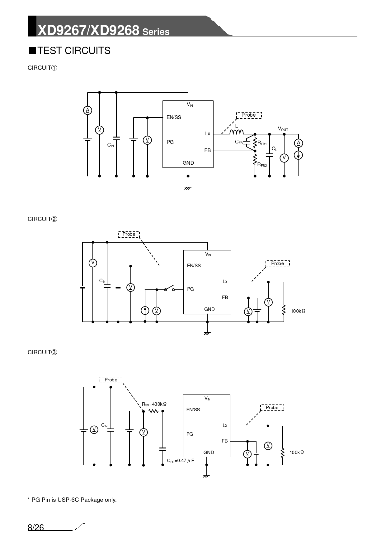 ■TEST CIRCUITS CIRCUIT① VIN A EN/SS Probe L V VOUT Lx V PG CFB RFB1 A CIN FB CL V GND RFB2 CIRCUIT② Probe VIN V EN/SS Probe CIN Lx V PG FB V GND V V 100kΩ CIRCUIT③ Probe VIN RSS=430kΩ Probe EN/SS CIN Lx V V PG FB V GND V 100kΩ CSS=0.47μF * PG Pin is USP-6C Package only. 8/26