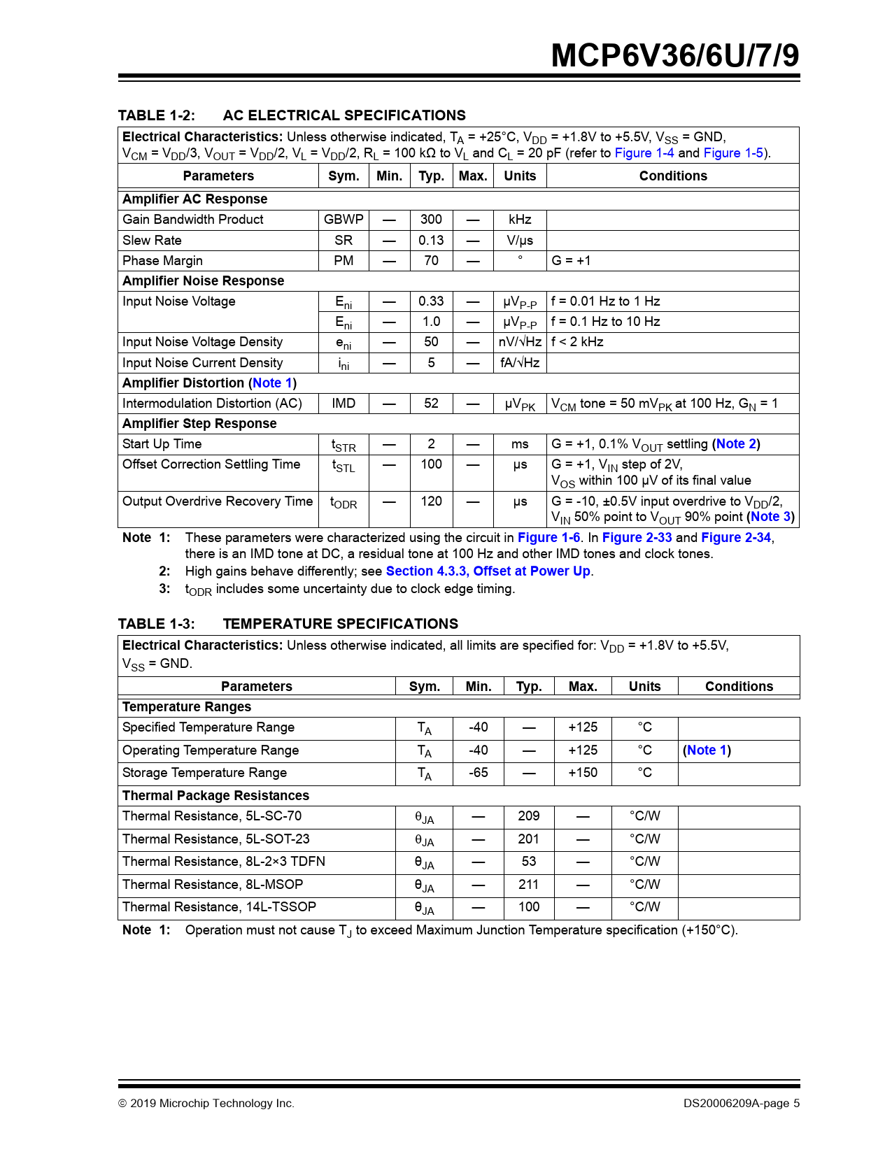 link to page 5 link to page 20 link to page 6 link to page 6 link to page 5 link to page 5 link to page 6 link to page 13 link to page 13 link to page 5 MCP6V36/6U/7/9TABLE 1-2:AC ELECTRICAL SPECIFICATIONSElectrical Characteristics: Unless otherwise indicated, TA = +25°C, VDD = +1.8V to +5.5V, VSS = GND, VCM = VDD/3, VOUT = VDD/2, VL = VDD/2, RL = 100 kΩ to VL and CL = 20 pF (refer to Figure 1-4 and Figure 1-5). ParametersSym.Min.Typ. Max.UnitsConditionsAmplifier AC Response Gain Bandwidth Product GBWP — 300 — kHz Slew Rate SR — 0.13 — V/µs Phase Margin PM — 70 — ° G = +1 Amplifier Noise Response Input Noise Voltage Eni — 0.33 — µVP-P f = 0.01 Hz to 1 Hz Eni — 1.0 — µVP-P f = 0.1 Hz to 10 Hz Input Noise Voltage Density eni — 50 — nV/√Hz f < 2 kHz Input Noise Current Density ini — 5 — fA/√Hz Amplifier Distortion (Note 1) Intermodulation Distortion (AC) IMD — 52 — µVPK VCM tone = 50 mVPK at 100 Hz, GN = 1 Amplifier Step Response Start Up Time tSTR — 2 — ms G = +1, 0.1% VOUT settling (Note 2) Offset Correction Settling Time tSTL — 100 — µs G = +1, VIN step of 2V, VOS within 100 µV of its final value Output Overdrive Recovery Time tODR — 120 — µs G = -10, ±0.5V input overdrive to VDD/2, VIN 50% point to VOUT 90% point (Note 3)Note 1: These parameters were characterized using the circuit in Figure 1-6 . In Figure 2-33 and Figure 2-34 , there is an IMD tone at DC, a residual tone at 100 Hz and other IMD tones and clock tones. 2: High gains behave differently; see Section 4.3.3, Offset at Power Up . 3: tODR includes some uncertainty due to clock edge timing. TABLE 1-3:TEMPERATURE SPECIFICATIONSElectrical Characteristics: Unless otherwise indicated, all limits are specified for: VDD = +1.8V to +5.5V, VSS = GND. ParametersSym.Min.Typ.Max.UnitsConditionsTemperature Ranges Specified Temperature Range TA -40 — +125 °C Operating Temperature Range TA -40 — +125 °C (Note 1) Storage Temperature Range TA -65 — +150 °C Thermal Package Resistances Thermal Resistance, 5L-SC-70 JA — 209 — °C/W Thermal Resistance, 5L-SOT-23 JA — 201 — °C/W Thermal Resistance, 8L-2×3 TDFN θJA — 53 — °C/W Thermal Resistance, 8L-MSOP θJA — 211 — °C/W Thermal Resistance, 14L-TSSOP θJA — 100 — °C/W Note 1: Operation must not cause TJ to exceed Maximum Junction Temperature specification (+150°C). 2019 Microchip Technology Inc. DS20006209A-page 5 Document Outline 23 µA, 300 kHz Zero-Drift Op Amps Features Typical Applications Design Aids Related Parts Description Package Types Typical Application Circuit 1.0 Electrical Characteristics 1.1 Absolute Maximum Ratings 1.2 Specifications TABLE 1-1: DC Electrical Specifications TABLE 1-2: AC Electrical Specifications TABLE 1-3: Temperature Specifications 1.3 Timing Diagrams FIGURE 1-1: Amplifier Start Up. FIGURE 1-2: Offset Correction Settling Time. FIGURE 1-3: Output Overdrive Recovery. 1.4 Test Circuits FIGURE 1-4: AC and DC Test Circuit for Most Noninverting Gain Conditions. FIGURE 1-5: AC and DC Test Circuit for Most Inverting Gain Conditions. FIGURE 1-6: Test Circuit for Dynamic Input Behavior. 2.0 Typical Performance Curves 2.1 DC Input Precision FIGURE 2-1: Input Offset Voltage. FIGURE 2-2: Input Offset Voltage Drift. FIGURE 2-3: Input Offset Voltage Quadratic Temp. Co. FIGURE 2-4: Input Offset Voltage vs. Power Supply Voltage with VCM = VCML. FIGURE 2-5: Input Offset Voltage vs. Power Supply Voltage with VCM = VCMH. FIGURE 2-6: Input Offset Voltage vs. Output Voltage. FIGURE 2-7: Input Offset Voltage vs. Common-Mode Voltage with VDD = 1.8V. FIGURE 2-8: Input Offset Voltage vs. Common-Mode Voltage with VDD = 5.5V. FIGURE 2-9: CMRR and PSRR vs. Ambient Temperature. FIGURE 2-10: DC Open-Loop Gain vs. Ambient Temperature. FIGURE 2-11: Input Bias and Offset Currents vs. Common-Mode Input Voltage with TA = +85°C. FIGURE 2-12: Input Bias and Offset Currents vs. Common-Mode Input Voltage with TA = +125°C. FIGURE 2-13: Input Bias and Offset Currents vs. Ambient Temperature with VDD = +5.5V. FIGURE 2-14: Input Bias Current vs. Input Voltage (below VSS). 2.2 Other DC Voltages and Currents FIGURE 2-15: Input Common-Mode Voltage Headroom (Range) vs. Ambient Temperature. FIGURE 2-16: Output Voltage Headroom vs. Output Current. FIGURE 2-17: Output Voltage Headroom vs. Ambient Temperature. FIGURE 2-18: Output Short Circuit Current vs. Power Supply Voltage. FIGURE 2-19: Supply Current vs. Power Supply Voltage. FIGURE 2-20: Power-on Reset Voltage vs. Ambient Temperature. 2.3 Frequency Response FIGURE 2-21: CMRR and PSRR vs. Frequency. FIGURE 2-22: Open-Loop Gain vs. Frequency with VDD = 1.8V. FIGURE 2-23: Open-Loop Gain vs. Frequency with VDD = 5.5V. FIGURE 2-24: Gain Bandwidth Product and Phase Margin vs. Ambient Temperature. FIGURE 2-25: Gain Bandwidth Product and Phase Margin vs. Common-Mode Input Voltage. FIGURE 2-26: Gain Bandwidth Product and Phase Margin vs. Output Voltage. FIGURE 2-27: Closed-Loop Output Impedance vs. Frequency with VDD = 1.8V. FIGURE 2-28: Closed-Loop Output Impedance vs. Frequency with VDD = 5.5V. FIGURE 2-29: Channel-to-Channel Separation vs. Frequency. FIGURE 2-30: Maximum Output Voltage Swing vs. Frequency. 2.4 Input Noise and Distortion FIGURE 2-31: Input Noise Voltage Density and Integrated Input Noise Voltage vs. Frequency. FIGURE 2-32: Input Noise Voltage Density vs. Input Common-Mode Voltage. FIGURE 2-33: Intermodulation Distortion vs. Frequency with VCM Disturbance (see Figure 1-6). FIGURE 2-34: Intermodulation Distortion vs. Frequency with VDD Disturbance (see Figure 1-6). FIGURE 2-35: Input Noise vs. Time with 1 Hz and 10 Hz Filters and VDD = 1.8V. FIGURE 2-36: Input Noise vs. Time with 1 Hz and 10 Hz Filters and VDD = 5.5V. 2.5 Time Response FIGURE 2-37: Input Offset Voltage vs. Time at Power Up. FIGURE 2-38: The MCP6V36/6U/7/9 Family Shows No Input Phase Reversal with Overdrive. FIGURE 2-39: Noninverting Small Signal Step Response. FIGURE 2-40: Noninverting Lar