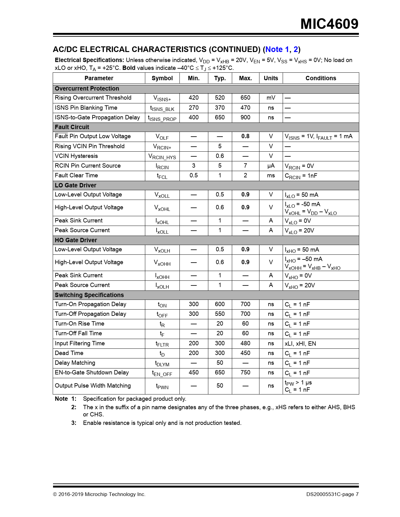 MIC4609AC/DC ELECTRICAL CHARACTERISTICS (CONTINUED) (Note 1, 2)Electrical Specifications: Unless otherwise indicated, VDD = VxHB = 20V, VEN = 5V, VSS = VxHS = 0V; No load on xLO or xHO, TA = +25°C. Bold values indicate –40°C TJ +125°C. ParameterSymbolMin.Typ.Max.UnitsConditionsOvercurrent Protection Rising Overcurrent Threshold VISNS+ 420 520 650 mV — ISNS Pin Blanking Time tISNS_BLK 270 370 470 ns — ISNS-to-Gate Propagation Delay tISNS_PROP 400 650 900 ns — Fault Circuit Fault Pin Output Low Voltage VOLF — — 0.8 V VISNS = 1V, IFAULT = 1 mA Rising VCIN Pin Threshold VRCIN+ — 5 — V — VCIN Hysteresis VRCIN_HYS — 0.6 — V — RCIN Pin Current Source IRCIN 3 5 7 µA VRCIN = 0V Fault Clear Time tFCL 0.5 1 2 ms CRCIN = 1nF LO Gate Driver Low-Level Output Voltage VxOLL — 0.5 0.9 V IxLO = 50 mA I High-Level Output Voltage V xLO = -50 mA xOHL — 0.6 0.9 V VxOHL = VDD – VxLO Peak Sink Current IxOHL — 1 — A VxLO = 0V Peak Source Current IxOLL — 1 — A VxLO = 20V HO Gate Driver Low-Level Output Voltage VxOLH — 0.5 0.9 V IxHO = 50 mA I High-Level Output Voltage V xHO = –50 mA xOHH — 0.6 0.9 V VxOHH = VxHB – VxHO Peak Sink Current IxOHH — 1 — A VxHO = 0V Peak Source Current IxOLH — 1 — A VxHO = 20V Switching Specifications Turn-On Propagation Delay tON 300 600 700 ns CL = 1 nF Turn-Off Propagation Delay tOFF 300 550 700 ns CL = 1 nF Turn-On Rise Time tR — 20 60 ns CL = 1 nF Turn-Off Fall Time tF — 20 60 ns CL = 1 nF Input Filtering Time tFLTR 200 300 480 ns xLI, xHI, EN Dead Time tD 200 300 450 ns CL = 1 nF Delay Matching tDLYM — 50 — ns CL = 1 nF EN-to-Gate Shutdown Delay tEN_OFF 450 650 750 ns CL = 1 nF t Output Pulse Width Matching t PW > 1 µs PWN — 50 — ns CL = 1 nF Note 1: Specification for packaged product only. 2: The x in the suffix of a pin name designates any of the three phases, e.g., xHS refers to either AHS, BHS or CHS. 3: Enable resistance is typical only and is not production tested. 2016-2019 Microchip Technology Inc. DS20005531C-page 7 Document Outline 600V 3-Phase MOSFET/IGBT Driver Features Typical Applications General Description Package Type Functional Block Diagram MIC4609 – Top Level Circuit Functional Block Diagram MIC4609 – Phase x Drive Circuit Typical Application Circuit MIC4609 – 300V, 3-Phase Motor Driver 1.0 Electrical Characteristics Absolute Maximum Ratings Operating Ratings AC/DC Electrical Characteristics Temperature Characteristics 2.0 Typical Performance Curves FIGURE 2-1: VDD Quiescent Current vs. VDD Voltage. FIGURE 2-2: VDD Quiescent Current vs. Temperature. FIGURE 2-3: VHB Quiescent Current vs. VHB Voltage. FIGURE 2-4: VHB Quiescent Current vs. Temperature. FIGURE 2-5: VDD+HB Shutdown Current vs. Voltage. FIGURE 2-6: VDD+HB Shutdown Current vs. Temperature. FIGURE 2-7: VDD+HB Shutdown Current vs. Voltage. FIGURE 2-8: VDD+HB Shutdown Current vs. Temperature. FIGURE 2-9: VDD Operating Current vs. Frequency. FIGURE 2-10: VHB Operating Current vs. Frequency – One Phase. FIGURE 2-11: HO Output Sink ON-Resistance vs. VDD. FIGURE 2-12: HO Output Sink ON-Resistance vs. Temperature. FIGURE 2-13: LO Output Sink ON-Resistance vs. VDD. FIGURE 2-14: LO Output Sink ON-Resistance vs. Temperature. FIGURE 2-15: HO Output Source ON-Resistance vs. VDD. FIGURE 2-16: HO Output Source ON-Resistance vs. Temperature. FIGURE 2-17: LO Output Source ON-Resistance vs. VDD. FIGURE 2-18: LO Output Source ON-Resistance vs. Temperature. FIGURE 2-19: VDD/VHB ULVO vs. Temperature. FIGURE 2-20: Propagation Delay vs. VDD Voltage. FIGURE 2-21: Propagation Delay vs. Temperature. FIGURE 2-22: HO Rise Time vs. VDD Voltage. FIGURE 2-23: HO Fall Time vs. VDD Voltage. FIGURE 2-24: LO Rise Time vs. VDD Voltage. FIGURE 2-25: LO Fall Time vs. VDD Voltage. FIGURE 2-26: Rise/Fall Time vs. Temperature (VDD = 10V). FIGURE 2-27: Rise/Fall Time vs. Temperature (VDD = 20V). FIGURE 2-28: Dead Time vs. VDD Voltage. FIGURE 2-29: Dead Time vs. Temperature (VDD = 10V). FIGURE 2-30: Dead Time vs. Temperature (VDD = 20V). FIGURE 2-31: Overcurrent Threshold vs. VDD Voltage. FIGURE 2-32: Overcurrent Threshold vs. Temperature. FIGURE 2-33: Overcurrent Propagation Delay vs. VDD Voltage. FIGURE 2-34: Overcurrent Propagation Delay vs. Temperature. 3.0 Pin Descriptions TABLE 3-1: Pin Function Table 4.0 Functional Description 4.1 UVLO Protection 4.2 Startup and UVLO FIGURE 4-1: Startup and Fault Timing Diagram. TABLE 4-1: Operational Truth Table 4.3 Enable Inputs 4.4 Input Stage FIGURE 4-2: Input Stage Block Diagram. FIGURE 4-3: Minimum Pulse-Width Diagram. 4.5 Dead Time and Anti-Shoot-Through Protection FIGURE 4-4: Dead Time, Propagation Delay, and Rise/Fall-Time Diagram. 4.6 Low-Side Driver Output Stage FIGURE 4-5: Low-Side Driver Block Diagram. 4.7 High-Side Driver and Bootstrap Circuit FIGURE 4-6: High-Side Driver and Bootstrap Circuit Block Diagram. FIGURE 4-7: MIC4609 Motor Driver Typical Application – Phase A. 4.8 Overcurrent Protection Circuitry FIGURE 4-8: Overcurrent Fault Sequence. 5.0 Application Information 5.1 Bootstrap Circuit FIGURE 5-1: MIC4609 – Bootstrap Circuit. 5.2 HS Node Clamp FIGURE 5-2: Negative HS Pin Voltage. 5.3 Power Dissipation Considerations FIGURE 5-3: MIC4609 High-Side Driving an External IGBT. FIGURE 5-4: Typical Gate Charge vs. VGE. 5.4 Decoupling Capacitor Selection 5.5 Grounding, Component Placement, and Circuit Layout FIGURE 5-5: Turn-On Current Paths. FIGURE 5-6: Turn-Off Current Paths. 6.0 Packaging Information 6.1 Package Marking Information 28-Lead SOICW Package Outline and Recommended Land Pattern Appendix A: Revision History Revision C (September 2019) Revision B (November 2017) Revision A (March 2016) Product Identification System Trademark Worldwide Sales and Service