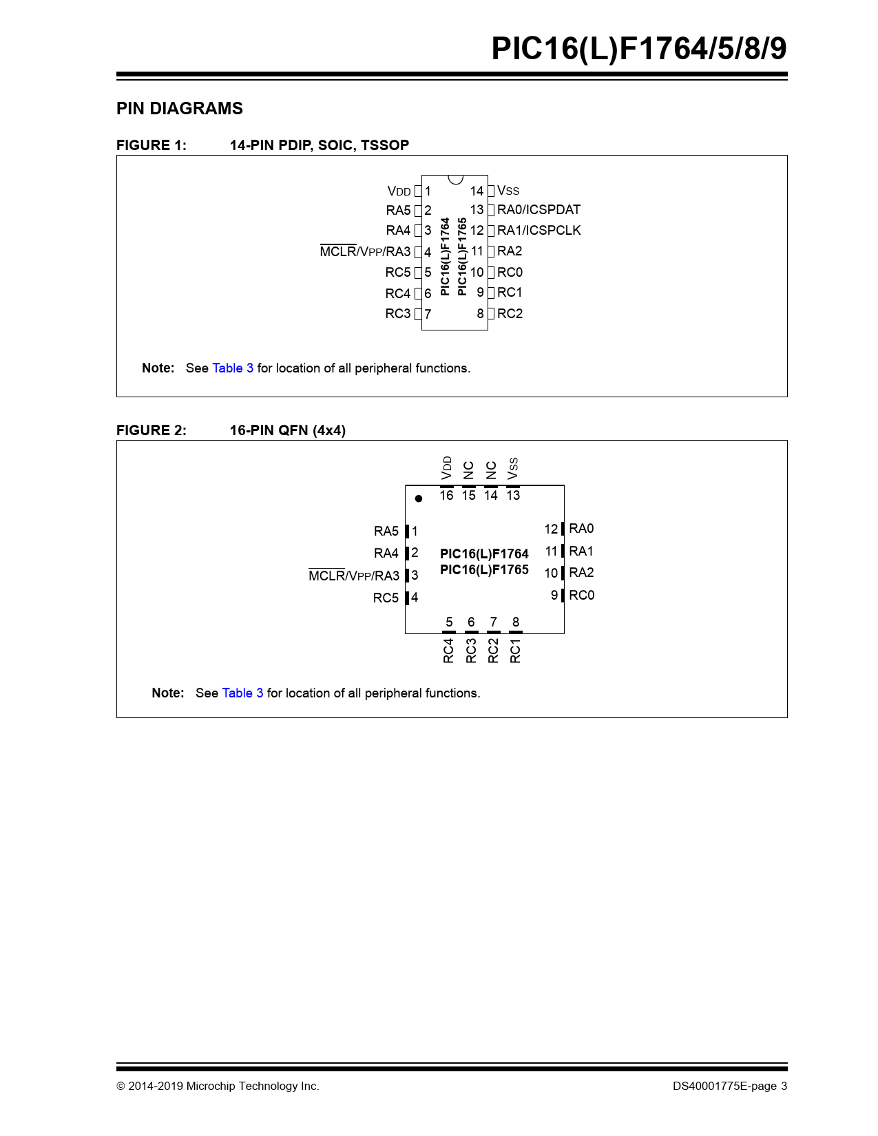 PIC16(L)F1764/5/8/9. PIN DIAGRAMS. FIGURE 1:. 14-PIN PDIP, SOIC, TSSOP. 1764. 1765. IC16(L. Note:. FIGURE 2:. 16-PIN QFN (4x4)