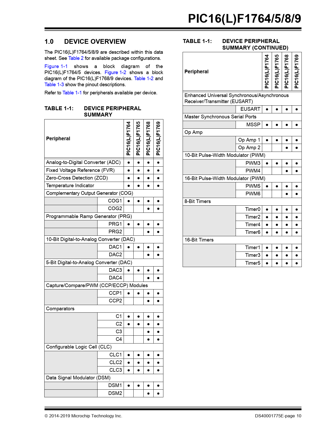| Pages / Page | 568 / 10 — PIC16(L)F1764/5/8/9. 1.0. DEVICE OVERVIEW. TABLE 1-1:. DEVICE PERIPHERAL … |