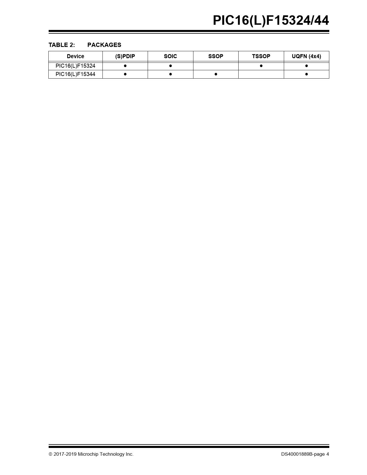 PIC16(L)F15324/44. TABLE 2:. PACKAGES. Device. (S)PDIP. SOIC. SSOP. TSSOP. UQFN (4x4)