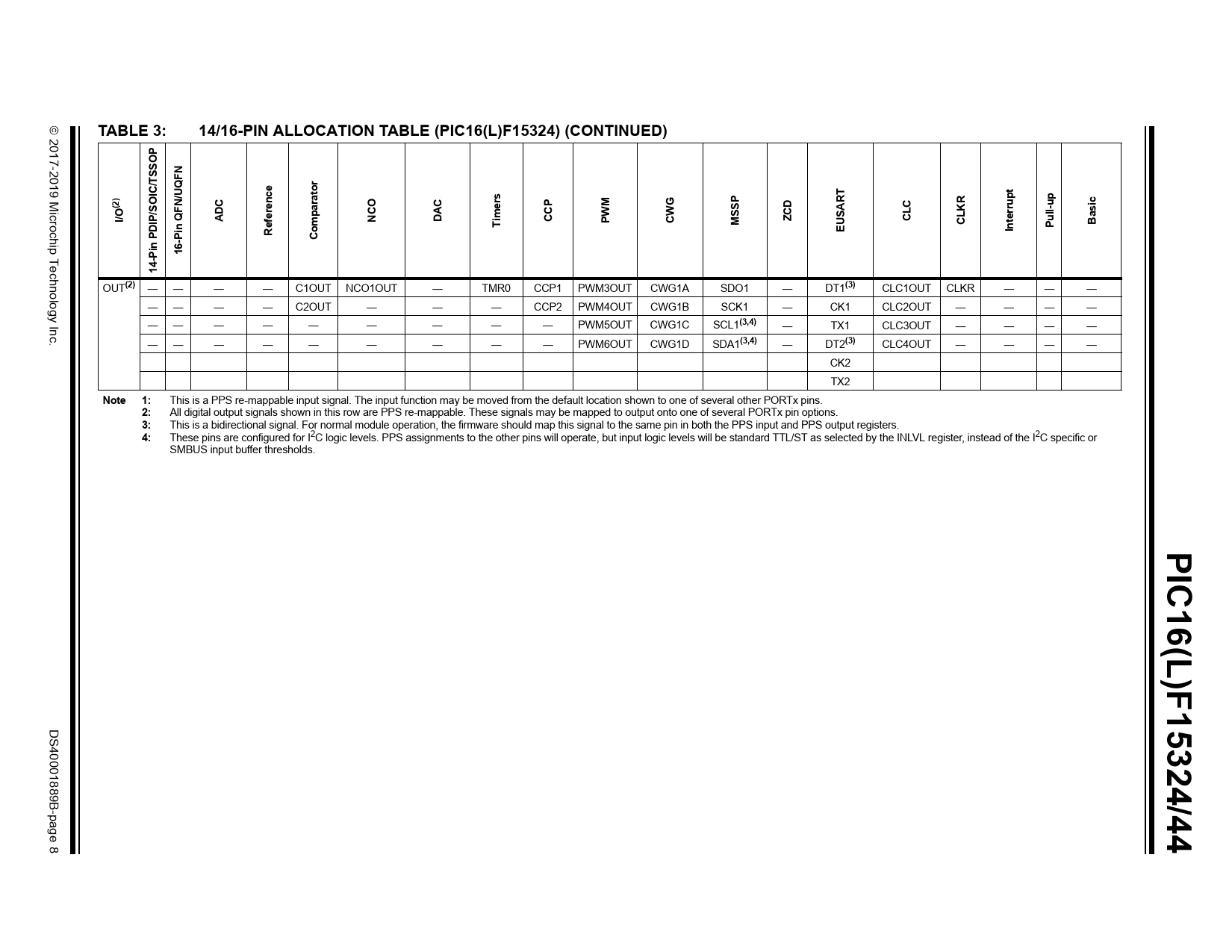 | Pages / Page | 557 / 8 — TABLE 3:. 14/16-PIN ALLOCATION TABLE (PIC16(L)F15324) (CONTINUED). tor. … |
