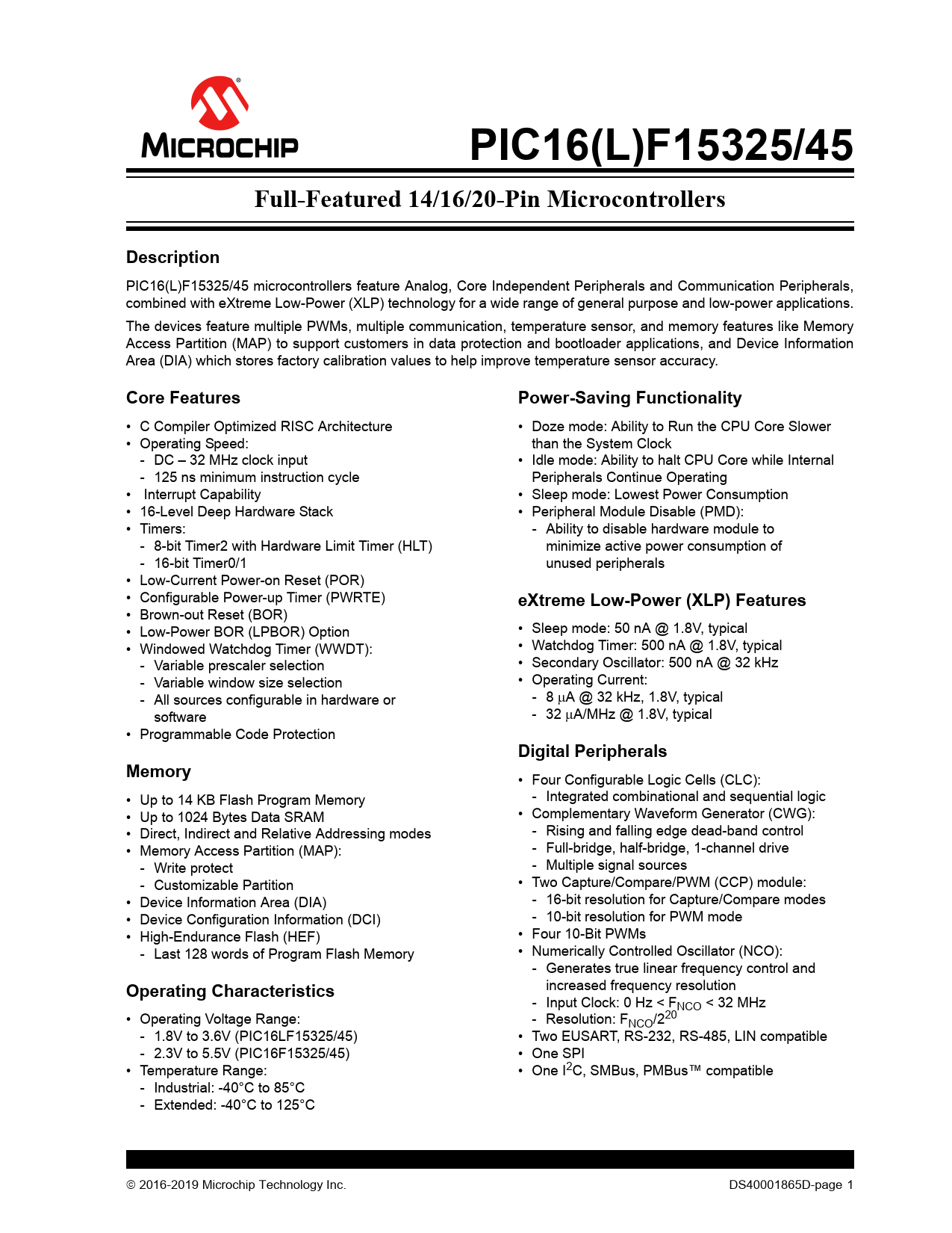 PIC16(L)F15325/45. Full-Featured 14/16/20-Pin Microcontrollers. Description. Core Features. Power-Saving Functionality