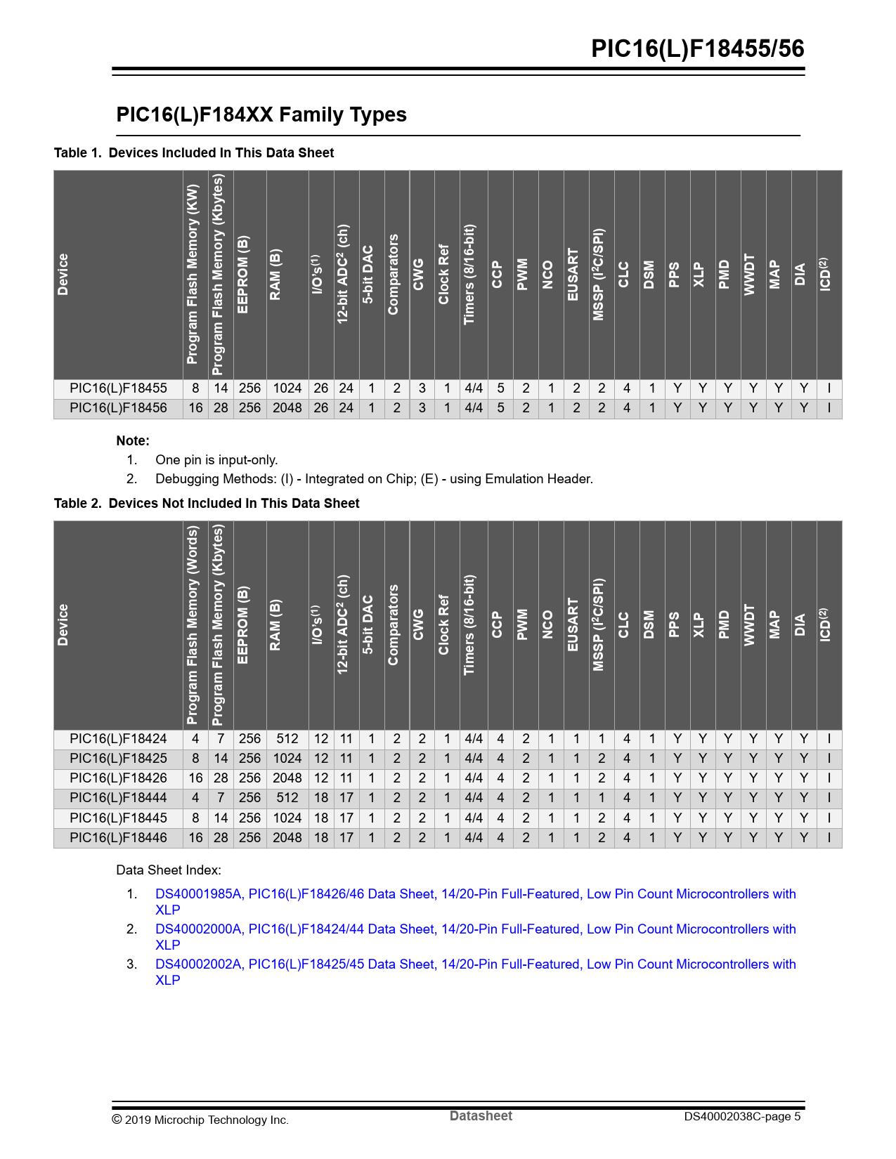 | Pages / Page | 706 / 5 — PIC16(L)F18455/56. PIC16(L)F184XX Family Types. Table 1. Devices Included … |