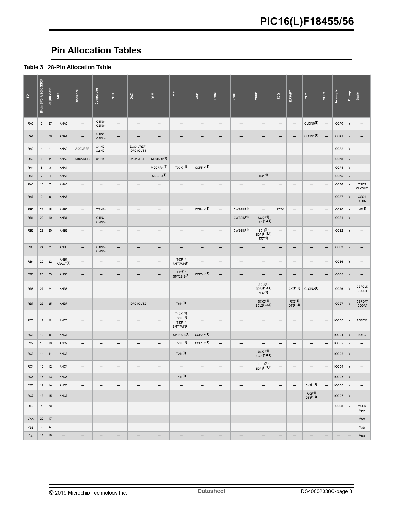 | Pages / Page | 706 / 8 — PIC16(L)F18455/56. Pin Allocation Tables. Table 3. 28-Pin Allocation … |
