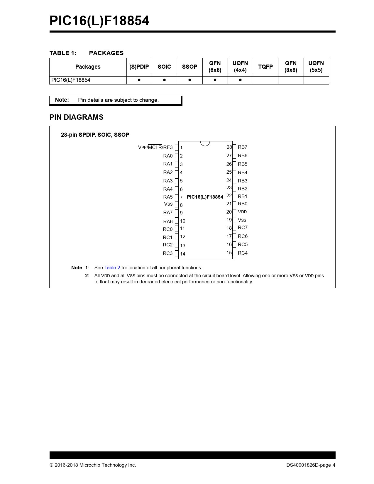 PIC16(L)F18854. TABLE 1:. PACKAGES. QFN. UQFN. Packages. (S)PDIP. SOIC. SSOP. TQFP. (6x6). (4x4). (8x8). (5x5). Note:. PIN DIAGRAMS