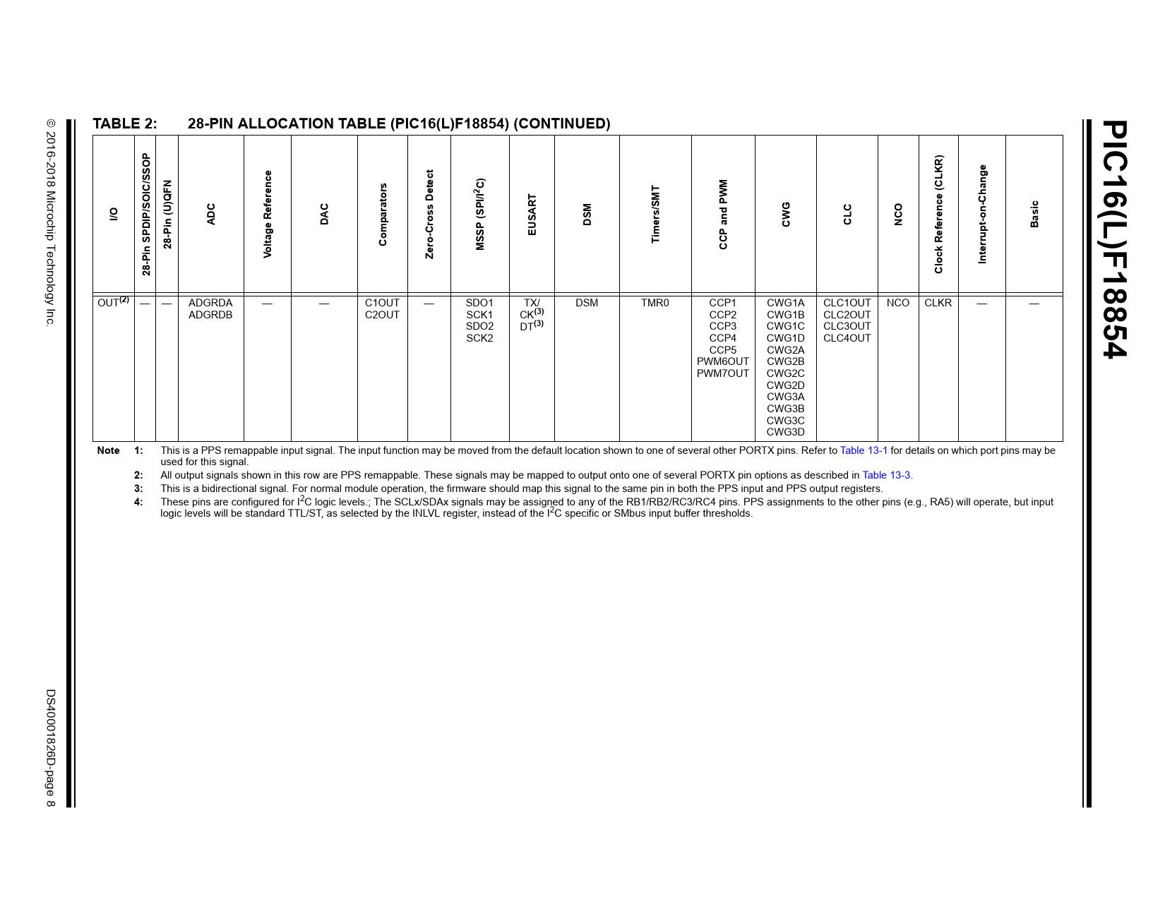TABLE 2: 28-PIN ALLOCATION TABLE (PIC16(L)F18854) (CONTINUED)