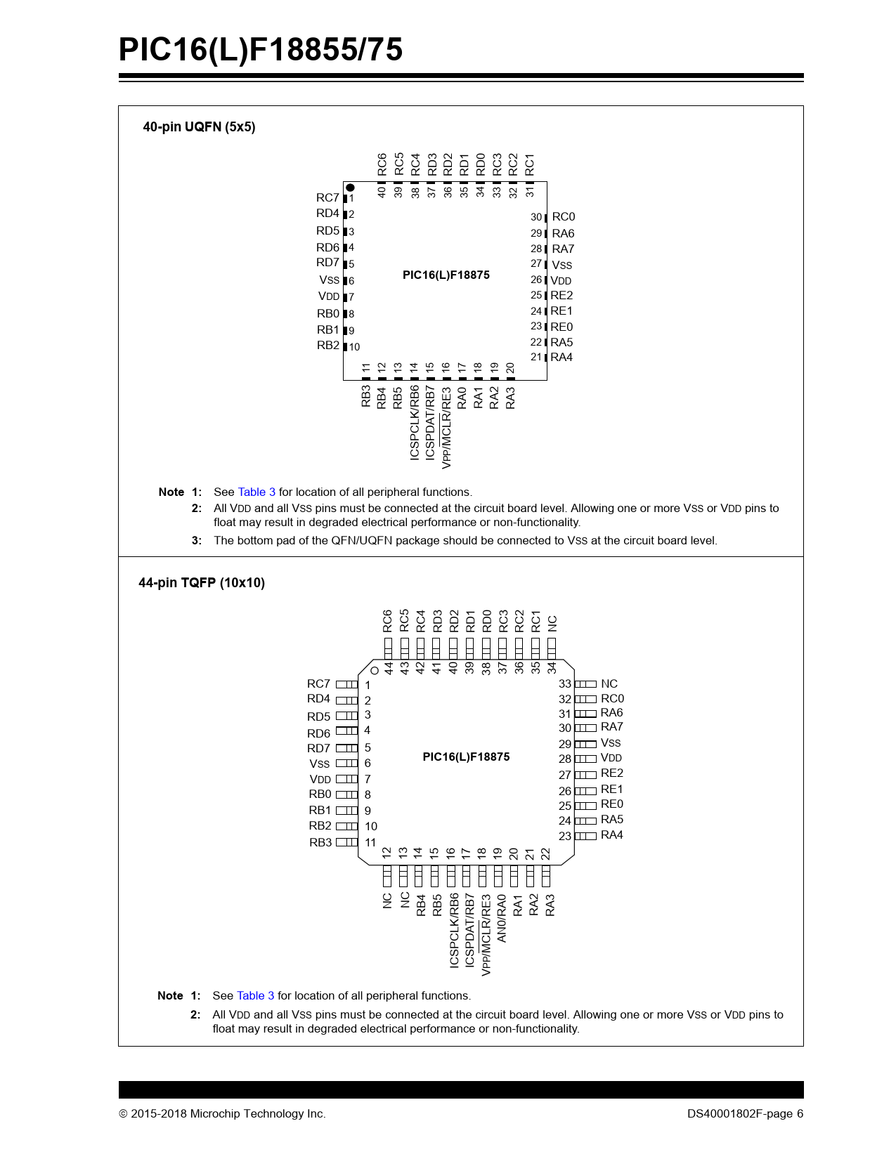| Pages / Page | 674 / 6 — PIC16(L)F18855/75. 40-pin UQFN (5x5). PIC16(L)F18875. Note 1:. 44-pin … |