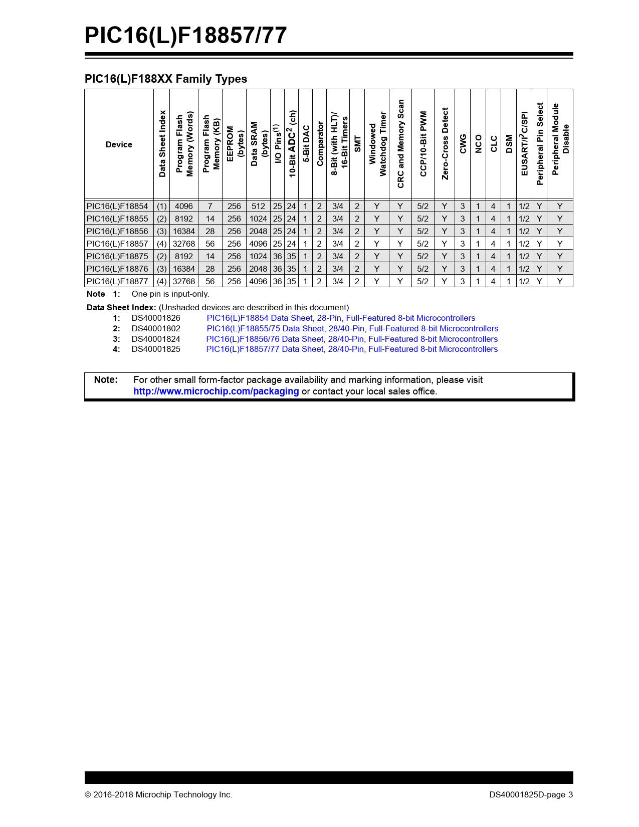 Model Line for this Datasheet Text Version of Document PIC16(L)F18857/77 PIC16(L)F188XX Family Types n le ) )/ r u dex elect ) LT etect S ords) (ch or ers ime ry Sca (1 2 ed o C/SPI le Flash Flash (KB) at im T it PWM G O C 2 Device eet In ry t DAC ar p ow og em eral Mod ram ram ytes) a SRAM ytes) ADC it T SMT M ross D CW NC CL DSM Disab g g (b Bi m ind C eral Pin a Sh o o EEPROM (b I/O Pins 5- W SART/I h Memo Dat -Bit Co 16-B atchd and Dat Pr Memory (W Pr 10 8-Bit (with H W CCP/10-B Periph Zero- EU CRC Perip PIC16(L)F18854 (1) 4096 7 256 512 25 24 1 2 3/4 2 Y Y 5/2 Y 3 1 4 1 1/2 Y Y PIC16(L)F18855 (2) 8192 14 256 1024 25 24 1 2 3/4 2 Y Y 5/2 Y 3 1 4 1 1/2 Y Y PIC16(L)F18856 (3) 16384 28 256 2048 25 24 1 2 3/4 2 Y Y 5/2 Y 3 1 4 1 1/2 Y Y PIC16(L)F18857 (4) 32768 56 256 4096 25 24 1 2 3/4 2 Y Y 5/2 Y 3 1 4 1 1/2 Y Y PIC16(L)F18875 (2) 8192 14 256 1024 36 35 1 2 3/4 2 Y Y 5/2 Y 3 1 4 1 1/2 Y Y PIC16(L)F18876 (3) 16384 28 256 2048 36 35 1 2 3/4 2 Y Y 5/2 Y 3 1 4 1 1/2 Y Y PIC16(L)F18877 (4) 32768 56 256 4096 36 35 1 2 3/4 2 Y Y 5/2 Y 3 1 4 1 1/2 Y YNote 1: One pin is input-only.Data Sheet Index: (Unshaded devices are described in this document)1: DS40001826 PIC16(L)F18854 Data Sheet, 28-Pin, Full-Featured 8-bit Microcontrollers2: DS40001802 PIC16(L)F18855/75 Data Sheet, 28/40-Pin, Full-Featured 8-bit Microcontrollers3: DS40001824 PIC16(L)F18856/76 Data Sheet, 28/40-Pin, Full-Featured 8-bit Microcontrollers4: DS40001825 PIC16(L)F18857/77 Data Sheet, 28/40-Pin, Full-Featured 8-bit MicrocontrollersNote: For other small form-factor package availability and marking information, please visithttp://www.microchip.com/packaging or contact your local sales office. 2016-2018 Microchip Technology Inc. DS40001825D-page 3 Document Outline Description PIC16(L)F188XX Family Types Pin Diagrams Pin Allocation Tables Table of Contents 1.0 Device Overview TABLE 1-1: Device Peripheral Summary 1.1 Register and Bit naming conventions 1.1.1 Register Names 1.1.2 Bit Names 1.1.2.1 Short Bit Names 1.1.2.2 Long Bit Names 1.1.2.3 Bit Fields 1.1.3 Register and Bit Naming Exceptions 1.1.3.1 Status, Interrupt, and Mirror Bits 1.1.3.2 Legacy Peripherals FIGURE 1-1: PIC16(L)F18857/77 Block Diagram TABLE 1-2: PIC16F18857 Pinout Description TABLE 1-3: PIC16F18877 Pinout Description 2.0 Enhanced Mid-Range CPU FIGURE 2-1: Core Block Diagram 2.1 Automatic Interrupt Context Saving 2.2 16-Level Stack with Overflow and Underflow 2.3 File Select Registers 2.4 Instruction Set 3.0 Memory Organization 3.1 Program Memory Organization TABLE 3-1: Device Sizes and Addresses FIGURE 3-1: Program Memory Map And Stack For PIC16(L)F18857/77 3.1.1 Reading Program Memory as Data 3.1.1.1 RETLW Instruction EXAMPLE 3-1: RETLW Instruction 3.1.1.2 Indirect Read with FSR EXAMPLE 3-2: Accessing Program Memory Via FSR 3.2 Data Memory Organization 3.2.1 Core Registers TABLE 3-2: Core Registers 3.2.1.1 STATUS Register Register 3-1: STATUS: STATUS Register 3.2.2 Special Function Register 3.2.3 General Purpose RAM 3.2.3.1 Linear Access to GPR 3.2.4 Common RAM FIGURE 3-2: Banked Memory Partitioning 3.2.5 Device Memory Maps TABLE 3-3: PIC16(L)F18857 Memory Map Bank 0-7 TABLE 3-4: PIC16(L)F18877 Memory Map Bank 0-7 TABLE 3-5: PIC16F18857/77 Memory Map Bank 8-15 TABLE 3-6: PIC16F18857/77 Memory Map Bank 16-23 TABLE 3-7: PIC16(L)F18857/77 Memory Map Bank 24-31 TABLE 3-8: PIC16(L)F18857/77 Memory Map Bank 32-63 TABLE 3-9: PIC16F18857/77 Memory Map Bank 60-61 TABLE 3-10: PIC16(L)F18857/77 Memory Map, Bank 63 TABLE 3-11: PIC16F18857 Memory Map Bank 62 TABLE 3-12: PIC16F18877 Memory Map Bank 62 TABLE 3-13: Special Function Register Summary Banks 0-64 (ALL BANKS) TABLE 3-14: Special Function Register Summary Banks 0-63 3.3 PCL and PCLATH FIGURE 3-3: Loading Of PC In Different Situations 3.3.1 Modifying PCL 3.3.2 computed goto 3.3.3 Computed Function Calls 3.3.4 Branching 3.4 Stack 3.4.1 Accessing the Stack FIGURE 3-4: Accessing the Stack Example 1 FIGURE 3-5: Accessing the Stack Example 2 FIGURE 3-6: Accessing the Stack Example 3 FIGURE 3-7: Accessing the Stack Example 4 3.4.2 Overflow/Underflow Reset 3.5 Indirect Addressing FIGURE 3-8: Indirect Addressing 3.5.1 Traditional Data Memory FIGURE 3-9: Traditional Data Memory Map 3.5.2 Linear Data Memory FIGURE 3-10: Traditional Data Memory Map 3.5.3 Data EEPROM Memory 3.5.4 Program Flash Memory FIGURE 3-11: Program Flash Memory Map 4.0 Device Configuration 4.1 Configuration Words TABLE 4-1: Configuration Word Locations 4.2 Register Definitions: Configuration Words Register 4-1: CONFIG1: Configuration Word 1: Oscillators Register 4-2: CONFIG2: Configuration Word 2: Supervisors Register 4-3: CONFIG3: Configuration Word 3: Windowed Watchdog Register 4-4: CONFIG4: Configuration Word 4: Memory Register 4-5: CONFIG5: Configuration Word 5: Code Protection 4.3 Code Protection 4.3.1 Program Memory Protection 4.3.2 Data memory protection 4.4 Write Protection 4.5 User ID 4.6 Device ID and Revision ID 4.7 Register Definitions: Device and Revision Register 4-6: DevID: Device ID Register Register 4-7: RevisionID: Revision ID Register 5.0 Resets FIGURE 5-1: Simplified Block Diagram of On-Chip Reset Circuit 5.1 Power-On Reset (POR) 5.2 Brown-Out Reset (BOR) TABLE 5-1: BOR Operating Modes 5.2.1 BOR is Always On 5.2.2 BOR is Off in Sleep 5.2.3 BOR Controlled by Software 5.2.4 BOR is always OFF FIGURE 5-2: Brown-Out Situations 5.3 Register Definitions: Brown-out Reset Control Register 5-1: BORCON: Brown-out Reset Control Register 5.4 MCLR TABLE 5-2: MCLR Configuration 5.4.1 MCLR Enabled 5.4.2 MCLR Disabled 5.5 Windowed Watchdog Timer (WWDT) Reset 5.6 RESET Instruction 5.7 Stack Overflow/Underflow Reset 5.8 Programming Mode Exit 5.9 Power-Up Timer 5.10 Start-up Sequence FIGURE 5-3: Reset Start-up Sequence 5.11 Determining the Cause of a Reset TABLE 5-3: Reset Status Bits and Their Significance TABLE 5-4: Reset Condition for Special Registers 5.12 Power Control (PCON) Register 5.13 Register Definitions: Power Control Register 5-2: PCON0: Power
