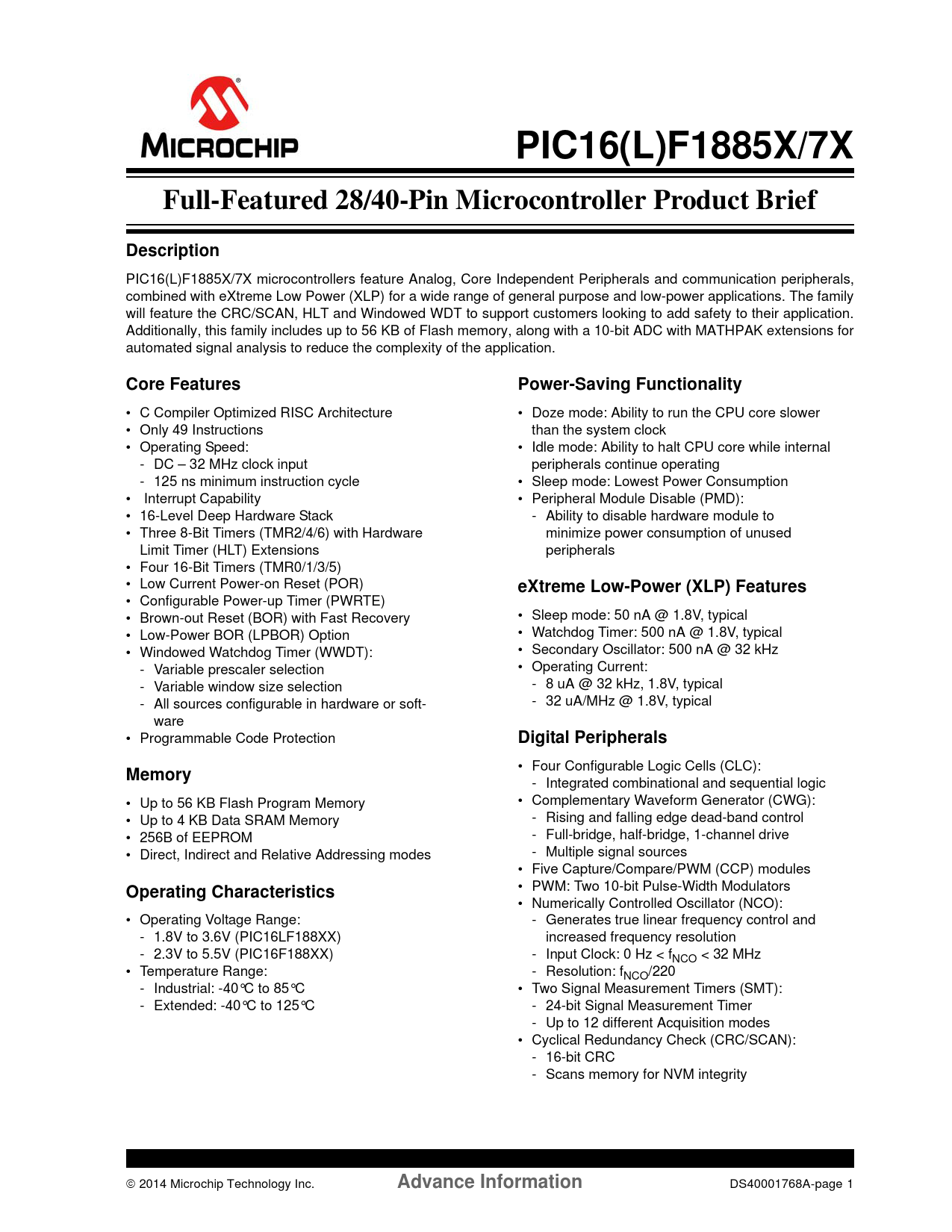 PIC16(L)F1885X/7X Full-Featured 28/40-Pin Microcontroller Product Brief Description PIC16(L)F1885X/7X microcontrollers feature Analog, Core Independent Peripherals and communication peripherals, combined with eXtreme Low Power (XLP) for a wide range of general purpose and low-power applications. The family will feature the CRC/SCAN, HLT and Windowed WDT to support customers looking to add safety to their application. Additionally, this family includes up to 56 KB of Flash memory, along with a 10-bit ADC with MATHPAK extensions for automated signal analysis to reduce the complexity of the application. Core Features Power-Saving Functionality • C Compiler Optimized RISC Architecture • Only 49 Instructions • Operating Speed: -DC – 32 MHz clock input -125 ns minimum instruction cycle • Interrupt Capability • 16-Level Deep Hardware Stack • Three 8-Bit Timers (TMR2/4/6) with Hardware Limit Timer (HLT) Extensions • Four 16-Bit Timers (TMR0/1/3/5) • Low Current Power-on Reset (POR) • Configurable Power-up Timer (PWRTE) • Brown-out Reset (BOR) with Fast Recovery • Low-Power BOR (LPBOR) Option • Windowed Watchdog Timer (WWDT): -Variable prescaler selection -Variable window size selection -All sources configurable in hardware or software • Programmable Code Protection • Doze mode: Ability to run the CPU core slower than the system clock • Idle mode: Ability to halt CPU core while internal peripherals continue operating • Sleep mode: Lowest Power Consumption • Peripheral Module Disable (PMD): -Ability to disable hardware module to minimize power consumption of unused peripherals Memory • • • • Up to 56 KB Flash Program Memory Up to 4 KB Data SRAM Memory 256B of EEPROM Direct, Indirect and Relative Addressing modes Operating Characteristics • Operating Voltage Range: -1.8V to 3.6V (PIC16LF188XX) -2.3V to 5.5V (PIC16F188XX) • Temperature Range: -Industrial: -40°C to 85°C -Extended: -40°C to 125°C 2014 Microchip Technology Inc. eXtreme Low-Power (XLP) Features • • • • Sleep mode: 50 nA @ 1.8V, typical Watchdog Timer: 500 nA @ 1.8V, typical Secondary Oscillator: 500 nA @ 32 kHz Operating Current: -8 uA @ 32 kHz, 1.8V, typical -32 uA/MHz @ 1.8V, typical Digital Peripherals • Four Configurable Logic Cells (CLC): -Integrated combinational and sequential logic • Complementary Waveform Generator (CWG): -Rising and falling edge dead-band control -Full-bridge, half-bridge, 1-channel drive -Multiple signal sources • Five Capture/Compare/PWM (CCP) modules • PWM: Two 10-bit Pulse-Width Modulators • Numerically Controlled Oscillator (NCO): -Generates true linear frequency control and increased frequency resolution -Input Clock: 0 Hz < fNCO < 32 MHz -Resolution: fNCO/220 • Two Signal Measurement Timers (SMT): -24-bit Signal Measurement Timer -Up to 12 different Acquisition modes • Cyclical Redundancy Check (CRC/SCAN): -16-bit CRC -Scans memory for NVM integrity Advance Information DS40001768A-page 1