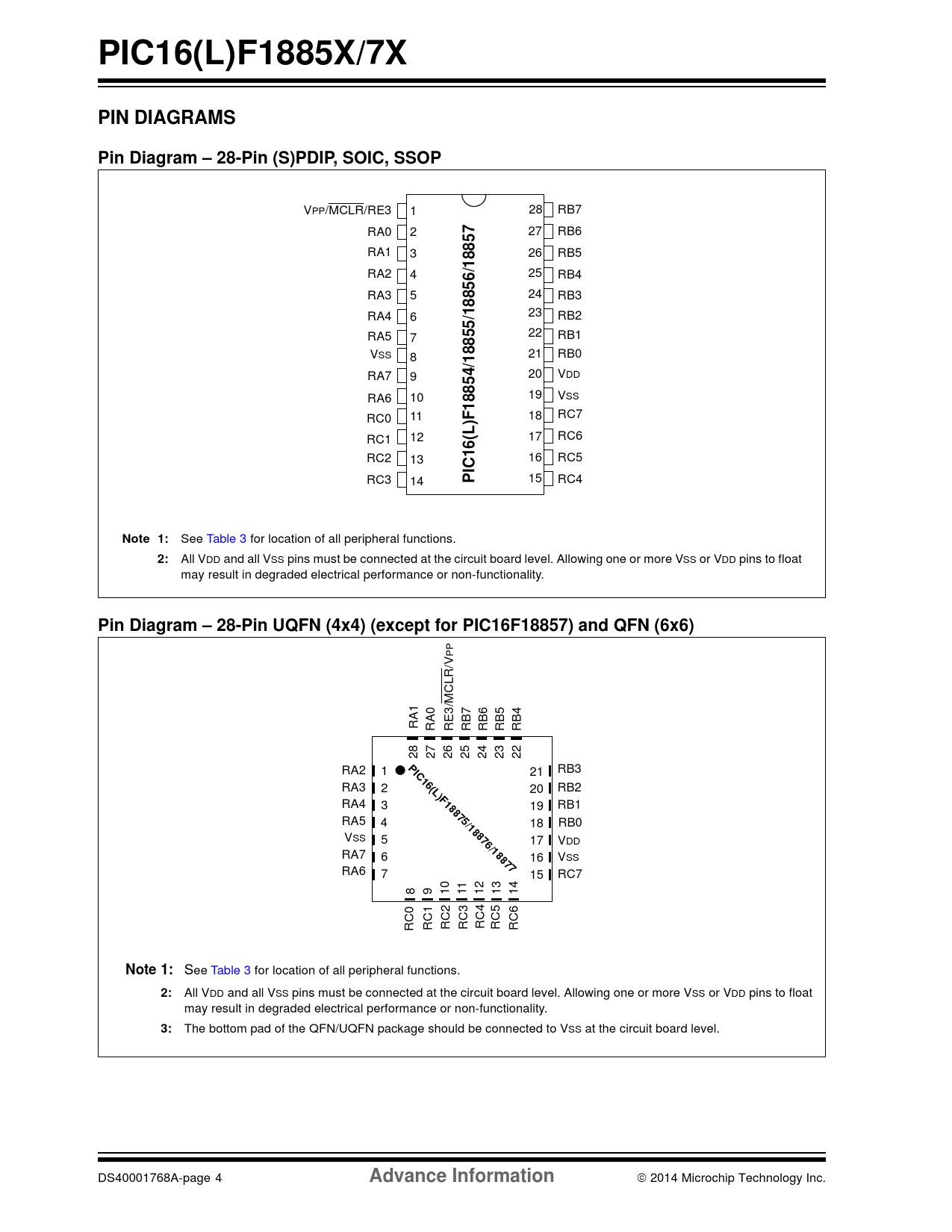 may result in degraded electrical performance or non-functionality. 3: The bottom pad of the QFN/UQFN package should be connected to VSS at the circuit board level. DS40001768A-page 4 Advance Information  2014 Microchip Technology Inc.