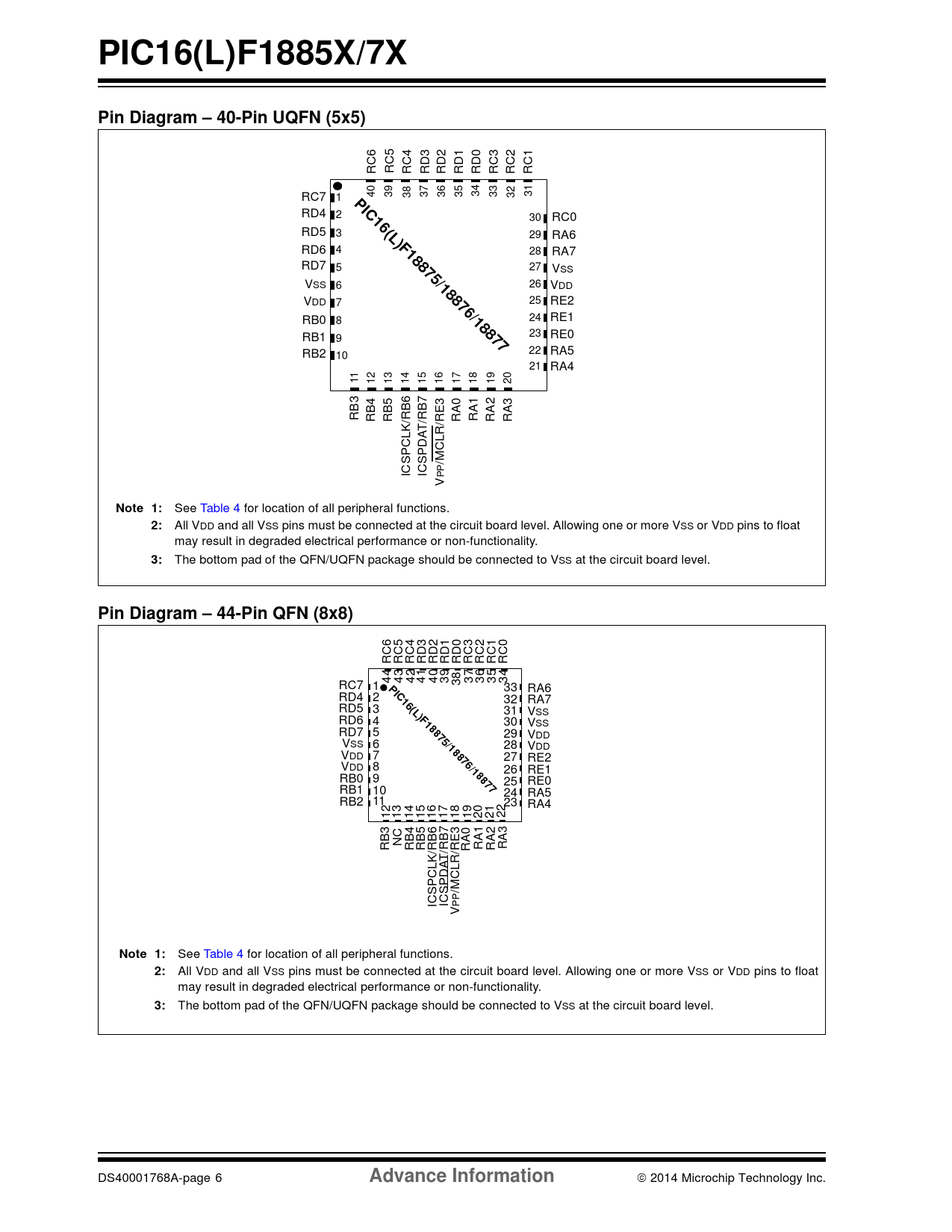 The bottom pad of the QFN/UQFN package should be connected to VSS at the circuit board level. DS40001768A-page 6 Advance Information 2014 Microchip Technology Inc.
