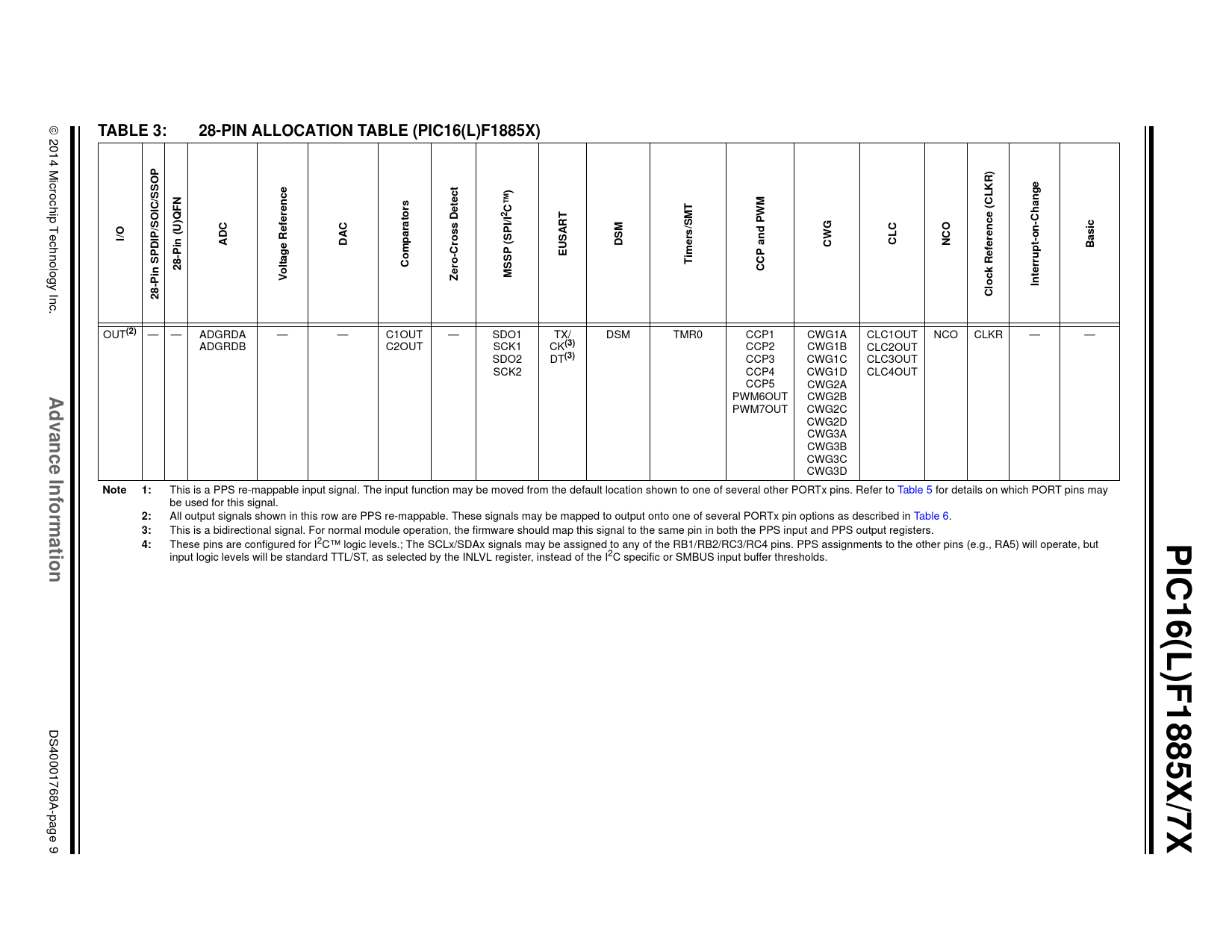 ADGRDB Comparators — DAC — Voltage Reference 28-Pin (U)QFN OUT(2) ADC 28-Pin SPDIP/SOIC/SSOP 28-PIN ALLOCATION TABLE (PIC16(L)F1885X) I/O  2014 Microchip Technology Inc. TABLE 3: