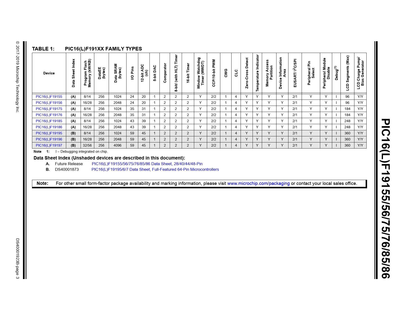 TABLE 1:. PIC16(L)F191XX FAMILY TYPES. imer. ato. KB). ati. SPI. dule. tor. Index. cess. s (Ma. tchdog. l Pi. (1). Pump/. ator. LT) T. ion. era. Device. m Fla. ent