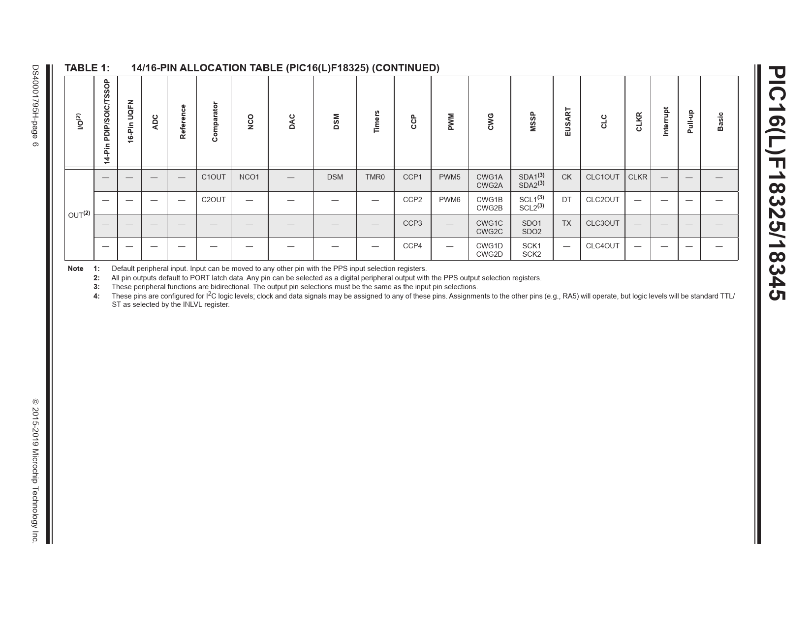 PIC16(L)F18325/18345. TABLE 1:. 14/16-PIN ALLOCATION TABLE (PIC16(L)F18325) (CONTINUED). (2). I/O. ADC. NCO. DAC. DSM. imers. CCP. CLC. PWM. CWG