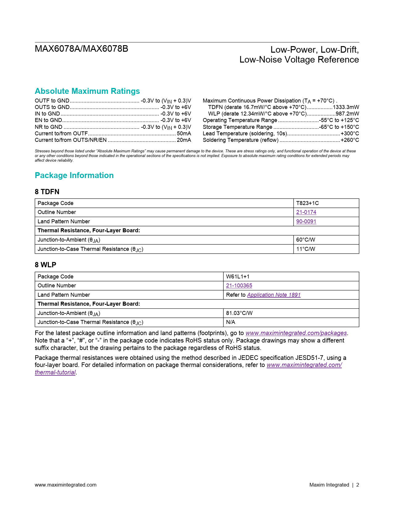 Absolute Maximum Ratings. Package Information. 8 TDFN. Thermal Resistance, Four-Layer Board:. 8 WLP