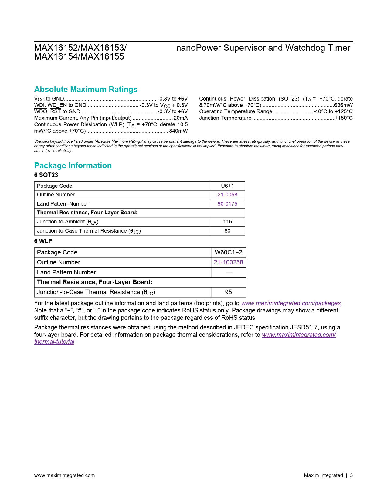 MAX16152/MAX16153/ nanoPower Supervisor and Watchdog Timer MAX16154/MAX16155 Absolute Maximum Ratings VCC to GND .. -0.3V to +6V Continuous Power Dissipation (SOT23) (TA = +70°C, derate WDI, WD_EN to GND ... -0.3V to VCC + 0.3V 8.70mW/°C above +70°C) ..696mW WDO, RST to GND ... -0.3V to +6V Operating Temperature Range ...-40°C to +125°C Maximum Current, Any Pin (input/output) ... 20mA Junction Temperature ... +150°C Continuous Power Dissipation (WLP) (TA = +70°C, derate 10.5 mW/°C above +70°C) ... 840mW Stresses beyond those listed under “Absolute Maximum Ratings” may cause permanent damage to the device. These are stress ratings only, and functional operation of the device at these or any other conditions beyond those indicated in the operational sections of the specifications is not implied. Exposure to absolute maximum rating conditions for extended periods may affect device reliability. Package Information 6 SOT23 Package Code U6+1 Outline Number 21-0058 Land Pattern Number 90-0175 Thermal Resistance, Four-Layer Board: Junction-to-Ambient (θJA) 115 Junction-to-Case Thermal Resistance (θJC) 80 6 WLP Package Code W60C1+2 Outline Number 21-100258 Land Pattern Number — Thermal Resistance, Four-Layer Board: Junction-to-Case Thermal Resistance (θJC) 95 For the latest package outline information and land patterns (footprints), go to www.maximintegrated.com/packages. Note that a “+”, “#”, or “-” in the package code indicates RoHS status only. Package drawings may show a different suffix character, but the drawing pertains to the package regardless of RoHS status. Package thermal resistances were obtained using the method described in JEDEC specification JESD51-7, using a four-layer board. For detailed information on package thermal considerations, refer to www.maximintegrated.com/ thermal-tutorial. www.maximintegrated.com Maxim Integrated | 3 Document Outline General Description Applications Benefits and Features Typical Application Circuit Absolute Maximum Ratings Package Information Electrical Characteristics Pin Configurations 6 WLP 6 SOT23 6 WLP 6 SOT23 Pin Description Functional Diagrams MAX16152/MAX16153 Block Diagram MAX16154/MAX16155 Block Diagram Detailed Description Input Threshold Watchdog Watchdog Startup Delay Watchdog Timeout Period Watchdog Enable Input (WD_EN) Watchdog Input Signal Reset Timeout Period Manual Reset Applications Information Power Supply Bypassing Watchdog Software Considerations Negative-Going VCC Transients Protection Selector Guide Ordering Information Revision History