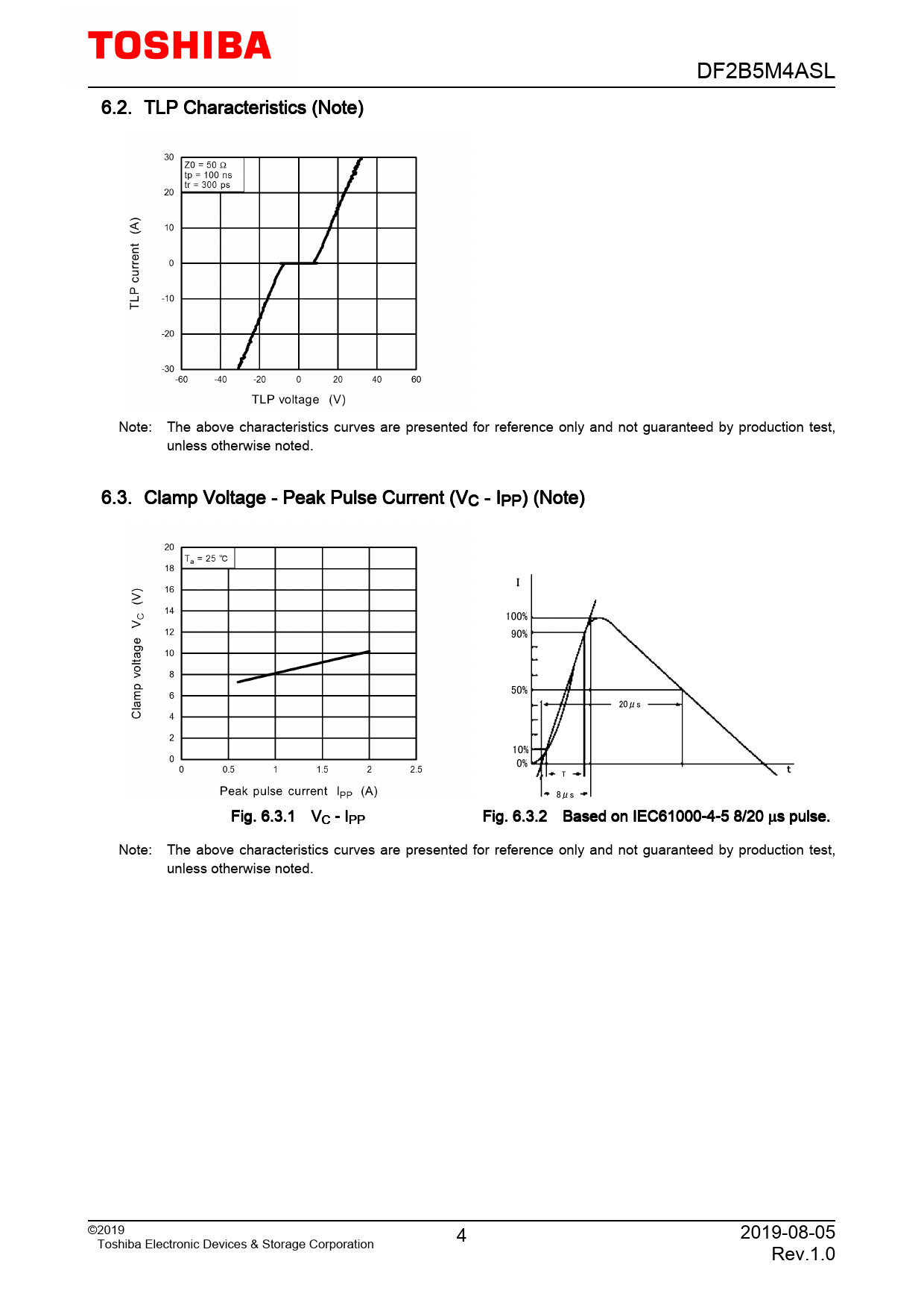 DF2B5M4ASL 6.2. TLP Characteristics (Note) Note: The above characteristics curves are presented for reference only and not guaranteed by production test, unless otherwise noted. 6.3. Clamp Voltage - Peak Pulse Current (VC - IPP) (Note) Fig. 6.3.1 VC - IPP Fig. 6.3.2 Based on IEC61000-4-5 8/20 µs pulse. Note: The above characteristics curves are presented for reference only and not guaranteed by production test, unless otherwise noted. ©2019 4 2019-08-05 Toshiba Electronic Devices & Storage Corporation Rev.1.0