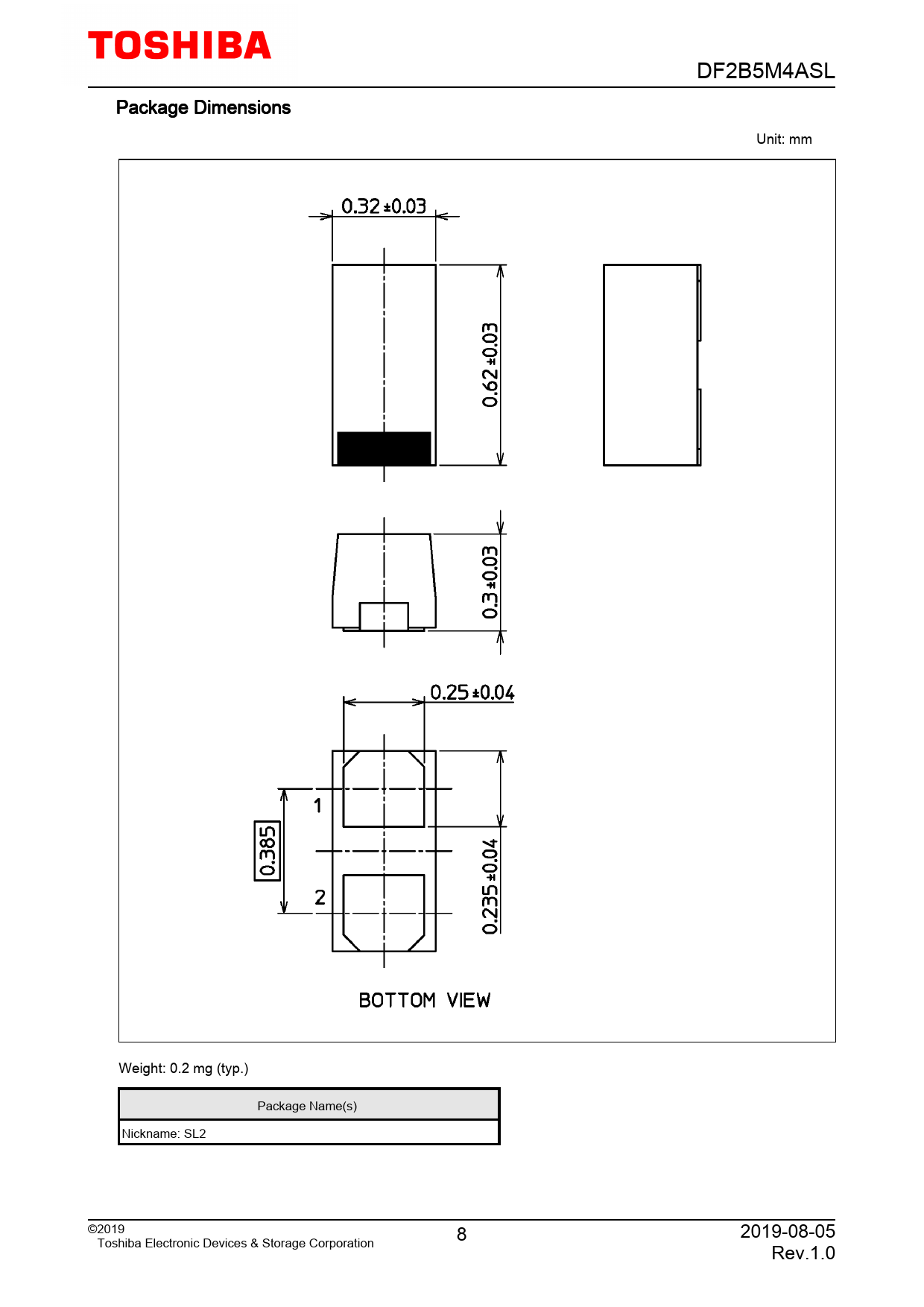 DF2B5M4ASL. Package. Dimensions. Unit:. mm. Weight:. 0.2. mg. (typ.). Package. Name(s). Nickname:. SL2. ©2019. 8. 2019-08-05. Toshiba. Electronic. Devices