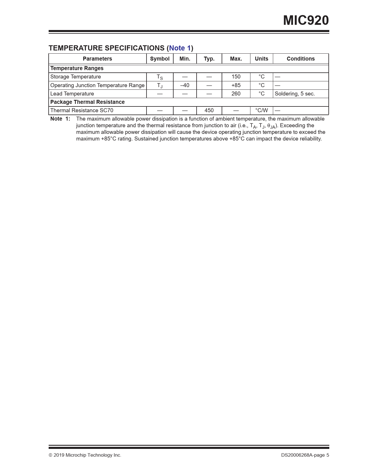 MIC920 TEMPERATURE SPECIFICATIONS (Note 1) Parameters Symbol Min. Typ. Max. Units Conditions Temperature Ranges