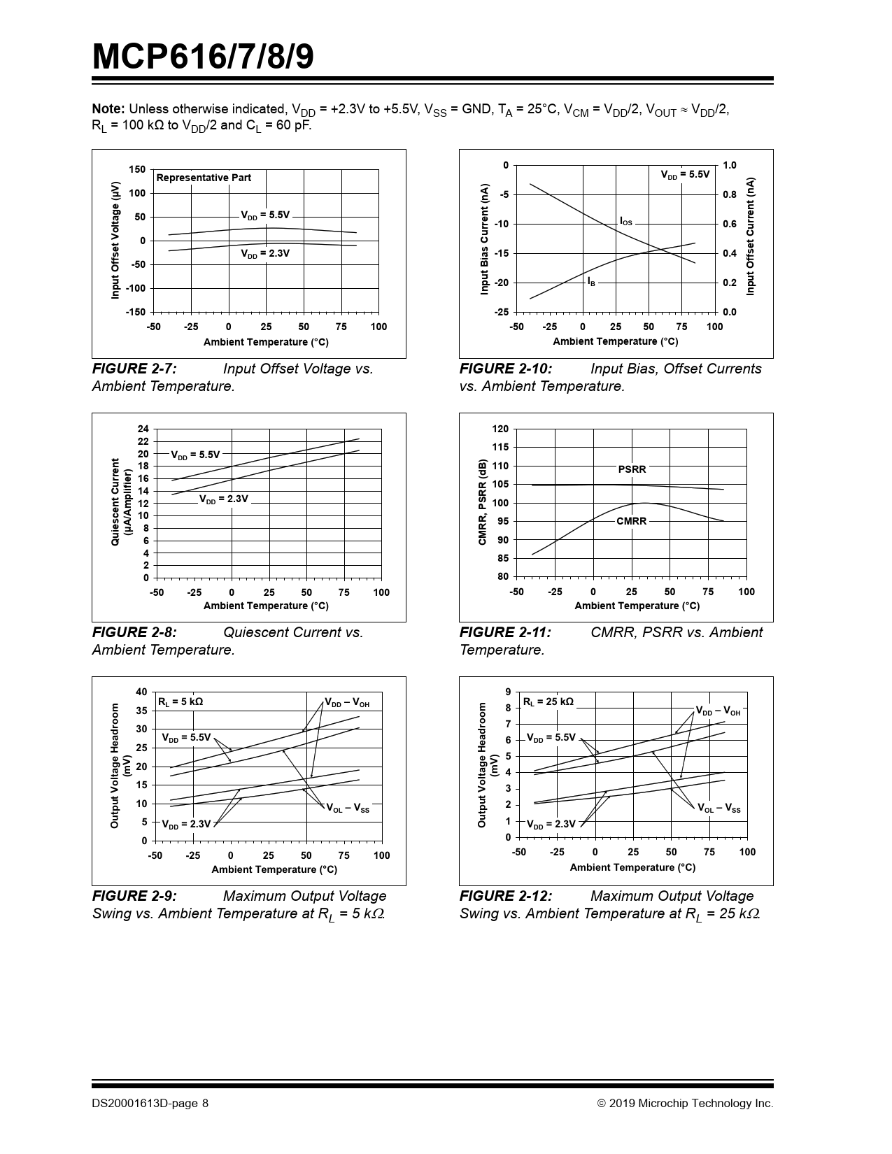 Maximum Output Voltage Swing vs. Ambient Temperature at RL = 5 k. Swing vs. Ambient Temperature at RL = 25 k. DS20001613D-page 8  2019 Microchip Technology Inc. Document Outline 2.3V to 5.5V Micropower Bi-CMOS Op Amps Features Typical Applications Design Aids Input Offset Voltage Description Package Types 1.0 Electrical Characteristics Absolute Maximum Ratings † DC Electrical Characteristics AC Electrical Characteristics MCP618 Chip Select (CS) Electrical Characteristics FIGURE 1-1: Timing Diagram for the CS Pin on the MCP618. Temperature Characteristics 1.1 Test Circuits FIGURE 1-2: AC and DC Test Circuit for Most Non-Inverting Gain Conditions. FIGURE 1-3: AC and DC Test Circuit for Most Inverting Gain Conditions. 2.0 Typical Performance Curves FIGURE 2-1: Input Offset Voltage at VDD = 5.5V. FIGURE 2-2: Input Offset Voltage at VDD = 2.3V. FIGURE 2-3: Input Bias Current at VDD = 5.5V. FIGURE 2-4: Input Offset Voltage Drift at VDD = 5.5V. FIGURE 2-5: Input Offset Voltage Drift at VDD = 2.3V. FIGURE 2-6: Input Offset Current at VDD = 5.5V. FIGURE 2-7: Input Offset Voltage vs. Ambient Temperature. FIGURE 2-8: Quiescent Current vs. Ambient Temperature. FIGURE 2-9: Maximum Output Voltage Swing vs. Ambient Temperature at RL = 5 kW. FIGURE 2-10: Input Bias, Offset Currents vs. Ambient Temperature. FIGURE 2-11: CMRR, PSRR vs. Ambient Temperature. FIGURE 2-12: Maximum Output Voltage Swing vs. Ambient Temperature at RL = 25 kW. FIGURE 2-13: Output Short Circuit Current vs. Ambient Temperature. FIGURE 2-14: Slew Rate vs. Ambient Temperature. FIGURE 2-15: Input Bias, Offset Currents vs. Common-mode Input Voltage. FIGURE 2-16: Gain Bandwidth Product, Phase Margin vs. Ambient Temperature. FIGURE 2-17: Input Offset Voltage vs. Common-mode Input Voltage. FIGURE 2-18: Input Offset Voltage vs. Output Voltage. FIGURE 2-19: Quiescent Current vs. Power Supply Voltage. FIGURE 2-20: DC Open-Loop Gain vs. Load Resistance. FIGURE 2-21: Gain-Bandwidth Product, Phase Margin vs. Load Resistance. FIGURE 2-22: Output Voltage Headroom vs. Output Current Magnitude. FIGURE 2-23: DC Open-Loop Gain vs. Power Supply Voltage. FIGURE 2-24: Channel-to-Channel Separation vs. Frequency (MCP617 and MCP619 only). FIGURE 2-25: Open-Loop Gain, Phase vs. Frequency. FIGURE 2-26: Input Noise Voltage, Current Densities vs. Frequency. FIGURE 2-27: Small-Signal, Non-Inverting Pulse Response. FIGURE 2-28: CMRR, PSRR vs. Frequency. FIGURE 2-29: Maximum Output Voltage Swing vs. Frequency. FIGURE 2-30: Small-Signal, Inverting Pulse Response. FIGURE 2-31: Large-Signal, Non-Inverting Pulse Response. FIGURE 2-32: Chip Select (CS) to Amplifier Output Response Time (MCP618 only). FIGURE 2-33: The MCP616/7/8/9 Show No Phase Reversal. FIGURE 2-34: Large-Signal, Inverting Pulse Response. FIGURE 2-35: Chip Select (CS) Internal Hysteresis (MCP618 only). FIGURE 2-36: Measured Input Current vs. Input Voltage (below VSS). 3.0 Pin Descriptions TABLE 3-1: Pin Function Table 3.1 Analog Outputs 3.2 Analog Inputs 3.3 Chip Select Digital Input (CS) 3.4 Power Supply Pins (VDD, VSS) 4.0 Applications Information 4.1 Rail-to-Rail Inputs Phase Reversal Input Voltage and Current Limits FIGURE 4-1: Simplified Analog Input ESD Structures. FIGURE 4-2: Protecting the Analog Inputs. Normal Operation 4.2 DC Offsets FIGURE 4-3: Example Circuit for Calculating DC Offset. FIGURE 4-4: Equivalent DC Circuit. EQUATION 4-1: 4.3 Rail-to-Rail Output 4.4 Capacitive Loads FIGURE 4-5: Output Resistor, RISO stabilizes large capacitive loads. FIGURE 4-6: Recommended RISO Values for Capacitive Loads. 4.5 MCP618 Chip Select (CS) 4.6 Supply Bypass 4.7 Unused Op Amps FIGURE 4-7: Unused Op Amps. 4.8 PCB Surface Leakage FIGURE 4-8: Example Guard Ring Layout for Inverting Gain. 4.9 Application Circuits FIGURE 4-9: High Gain Pre-amplifier. FIGURE 4-10: Two-Op Amp Instrumentation Amplifier. FIGURE 4-11: Three-Op Amp Instrumentation Amplifier. FIGURE 4-12: Precision Gain with Good Load Isolation. 5.0 Design Aids 5.1 SPICE Macro Model 5.2 Mindi™ Circuit Designer & Simulator 5.3 Microchip Advanced Part Selector (MAPS) 5.4 Analog Demonstration and Evaluation Boards 5.5 Application Notes 6.0 Packaging Information 6.1 Package Marking Information Appendix A: Revision History Product Identification System Worldwide Sales and Service