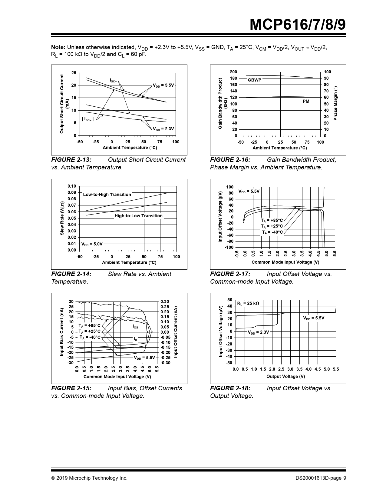 Input Offset Voltage vs. vs. Common-mode Input Voltage. Output Voltage.  2019 Microchip Technology Inc. DS20001613D-page 9 Document Outline 2.3V to 5.5V Micropower Bi-CMOS Op Amps Features Typical Applications Design Aids Input Offset Voltage Description Package Types 1.0 Electrical Characteristics Absolute Maximum Ratings † DC Electrical Characteristics AC Electrical Characteristics MCP618 Chip Select (CS) Electrical Characteristics FIGURE 1-1: Timing Diagram for the CS Pin on the MCP618. Temperature Characteristics 1.1 Test Circuits FIGURE 1-2: AC and DC Test Circuit for Most Non-Inverting Gain Conditions. FIGURE 1-3: AC and DC Test Circuit for Most Inverting Gain Conditions. 2.0 Typical Performance Curves FIGURE 2-1: Input Offset Voltage at VDD = 5.5V. FIGURE 2-2: Input Offset Voltage at VDD = 2.3V. FIGURE 2-3: Input Bias Current at VDD = 5.5V. FIGURE 2-4: Input Offset Voltage Drift at VDD = 5.5V. FIGURE 2-5: Input Offset Voltage Drift at VDD = 2.3V. FIGURE 2-6: Input Offset Current at VDD = 5.5V. FIGURE 2-7: Input Offset Voltage vs. Ambient Temperature. FIGURE 2-8: Quiescent Current vs. Ambient Temperature. FIGURE 2-9: Maximum Output Voltage Swing vs. Ambient Temperature at RL = 5 kW. FIGURE 2-10: Input Bias, Offset Currents vs. Ambient Temperature. FIGURE 2-11: CMRR, PSRR vs. Ambient Temperature. FIGURE 2-12: Maximum Output Voltage Swing vs. Ambient Temperature at RL = 25 kW. FIGURE 2-13: Output Short Circuit Current vs. Ambient Temperature. FIGURE 2-14: Slew Rate vs. Ambient Temperature. FIGURE 2-15: Input Bias, Offset Currents vs. Common-mode Input Voltage. FIGURE 2-16: Gain Bandwidth Product, Phase Margin vs. Ambient Temperature. FIGURE 2-17: Input Offset Voltage vs. Common-mode Input Voltage. FIGURE 2-18: Input Offset Voltage vs. Output Voltage. FIGURE 2-19: Quiescent Current vs. Power Supply Voltage. FIGURE 2-20: DC Open-Loop Gain vs. Load Resistance. FIGURE 2-21: Gain-Bandwidth Product, Phase Margin vs. Load Resistance. FIGURE 2-22: Output Voltage Headroom vs. Output Current Magnitude. FIGURE 2-23: DC Open-Loop Gain vs. Power Supply Voltage. FIGURE 2-24: Channel-to-Channel Separation vs. Frequency (MCP617 and MCP619 only). FIGURE 2-25: Open-Loop Gain, Phase vs. Frequency. FIGURE 2-26: Input Noise Voltage, Current Densities vs. Frequency. FIGURE 2-27: Small-Signal, Non-Inverting Pulse Response. FIGURE 2-28: CMRR, PSRR vs. Frequency. FIGURE 2-29: Maximum Output Voltage Swing vs. Frequency. FIGURE 2-30: Small-Signal, Inverting Pulse Response. FIGURE 2-31: Large-Signal, Non-Inverting Pulse Response. FIGURE 2-32: Chip Select (CS) to Amplifier Output Response Time (MCP618 only). FIGURE 2-33: The MCP616/7/8/9 Show No Phase Reversal. FIGURE 2-34: Large-Signal, Inverting Pulse Response. FIGURE 2-35: Chip Select (CS) Internal Hysteresis (MCP618 only). FIGURE 2-36: Measured Input Current vs. Input Voltage (below VSS). 3.0 Pin Descriptions TABLE 3-1: Pin Function Table 3.1 Analog Outputs 3.2 Analog Inputs 3.3 Chip Select Digital Input (CS) 3.4 Power Supply Pins (VDD, VSS) 4.0 Applications Information 4.1 Rail-to-Rail Inputs Phase Reversal Input Voltage and Current Limits FIGURE 4-1: Simplified Analog Input ESD Structures. FIGURE 4-2: Protecting the Analog Inputs. Normal Operation 4.2 DC Offsets FIGURE 4-3: Example Circuit for Calculating DC Offset. FIGURE 4-4: Equivalent DC Circuit. EQUATION 4-1: 4.3 Rail-to-Rail Output 4.4 Capacitive Loads FIGURE 4-5: Output Resistor, RISO stabilizes large capacitive loads. FIGURE 4-6: Recommended RISO Values for Capacitive Loads. 4.5 MCP618 Chip Select (CS) 4.6 Supply Bypass 4.7 Unused Op Amps FIGURE 4-7: Unused Op Amps. 4.8 PCB Surface Leakage FIGURE 4-8: Example Guard Ring Layout for Inverting Gain. 4.9 Application Circuits FIGURE 4-9: High Gain Pre-amplifier. FIGURE 4-10: Two-Op Amp Instrumentation Amplifier. FIGURE 4-11: Three-Op Amp Instrumentation Amplifier. FIGURE 4-12: Precision Gain with Good Load Isolation. 5.0 Design Aids 5.1 SPICE Macro Model 5.2 Mindi™ Circuit Designer & Simulator 5.3 Microchip Advanced Part Selector (MAPS) 5.4 Analog Demonstration and Evaluation Boards 5.5 Application Notes 6.0 Packaging Information 6.1 Package Marking Information Appendix A: Revision History Product Identification System Worldwide Sales and Service