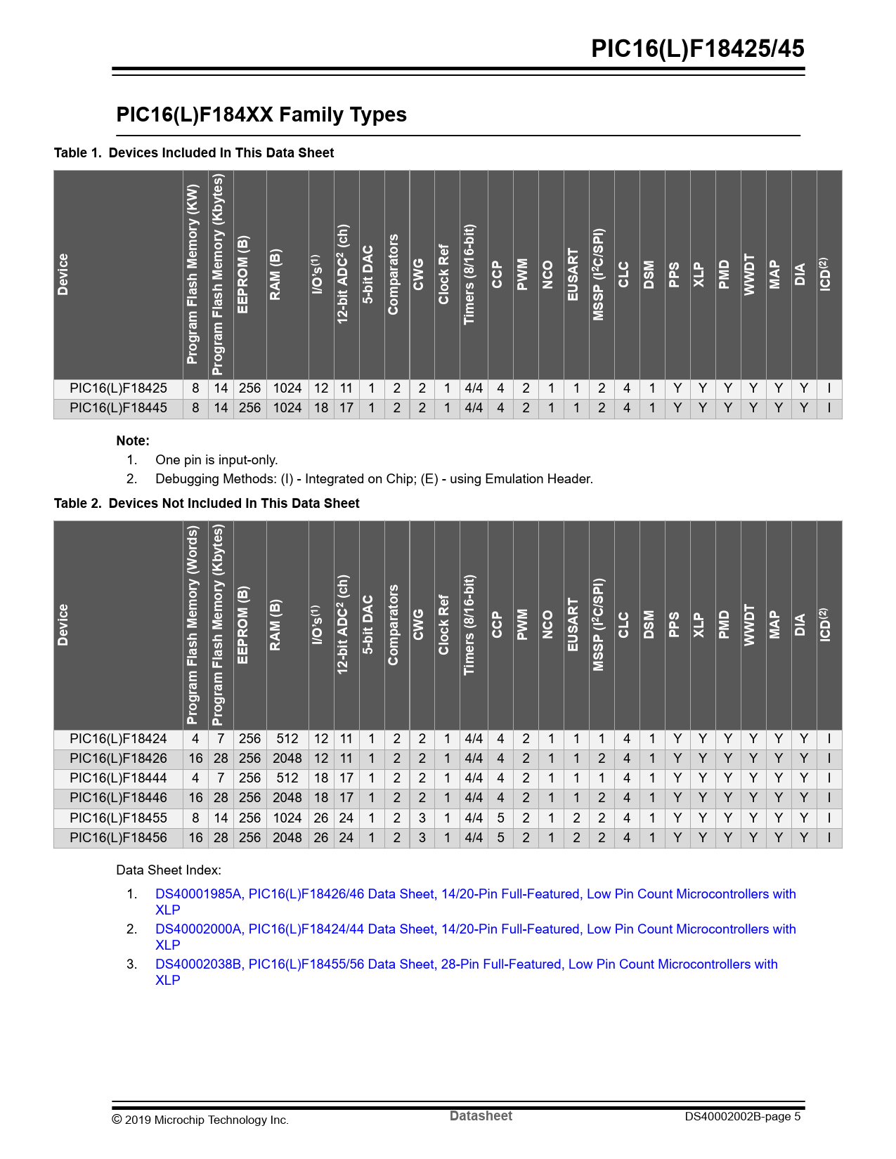 | Pages / Page | 708 / 5 — PIC16(L)F18425/45. PIC16(L)F184XX Family Types. Table 1. Devices Included … |