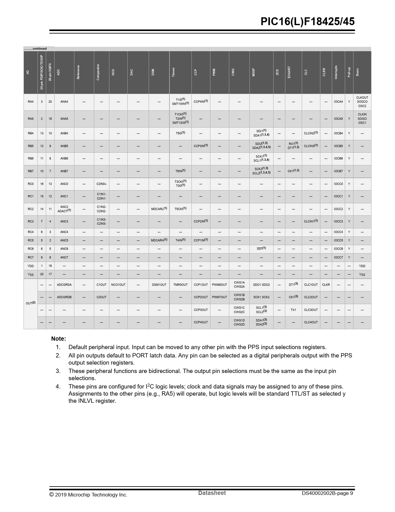 1. Default peripheral input. Input can be moved to any other pin with the PPS input selections registers. 2. All pin outputs default to PORT latch data. Any pin can be selected as a digital peripherals output with the PPS output selection registers. 3. These peripheral functions are bidirectional. The output pin selections must be the same as the input pin selections. 4. These pins are configured for I2C logic levels; clock and data signals may be assigned to any of these pins. Assignments to the other pins (e.g., RA5) will operate, but logic levels will be standard TTL/ST as selected y the INLVL register. © 2019 Microchip Technology Inc.