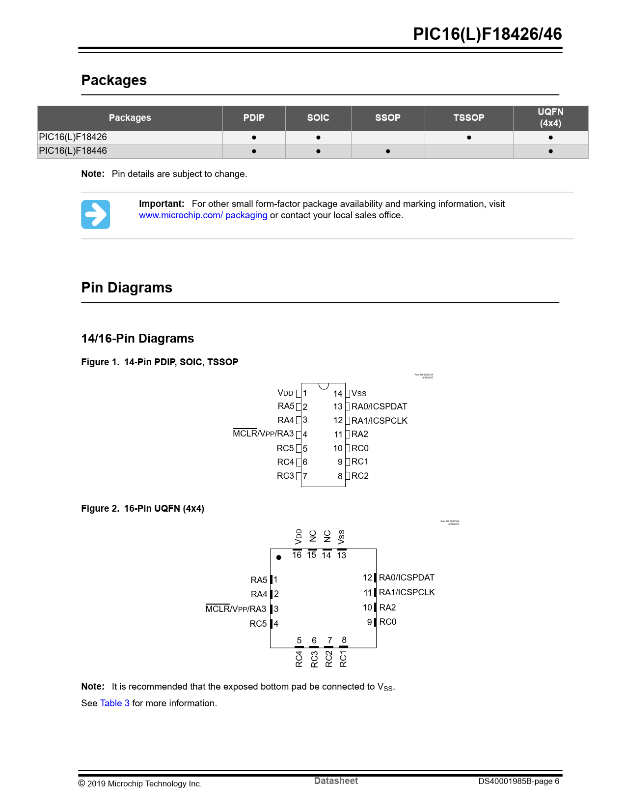 PIC16(L)F18426/46. Packages. UQFN. PDIP. SOIC. SSOP. TSSOP. (4x4). Note: . Important: . Pin Diagrams. 14/16-Pin Diagrams