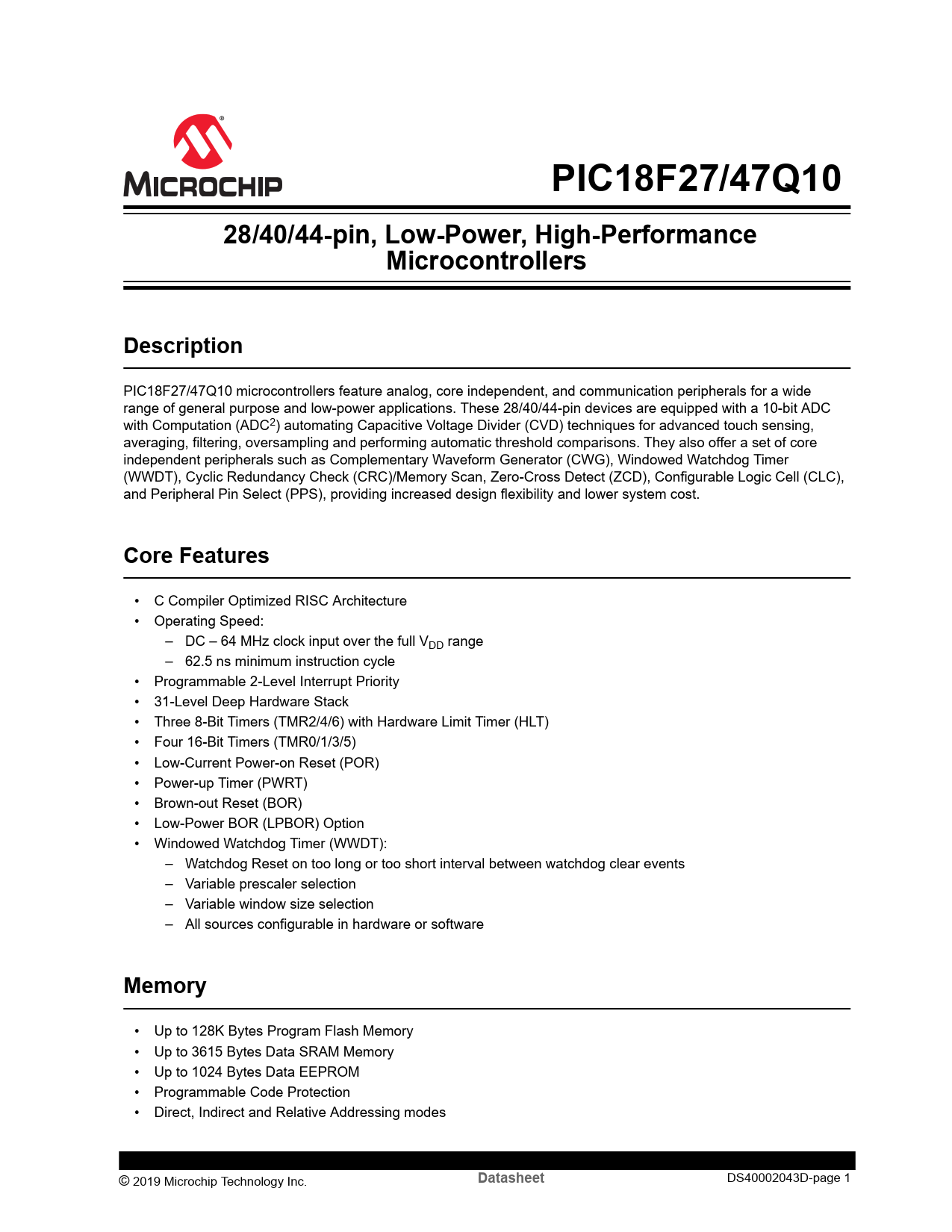 PIC18F27/47Q10. 28/40/44-pin, Low-Power, High-Performance. Microcontrollers. Description. Core Features. Memory. Datasheet