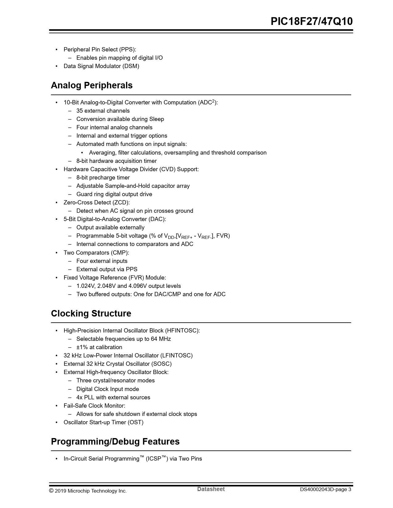 PIC18F27/47Q10. Analog Peripherals. Clocking Structure. Programming/Debug Features. Datasheet
