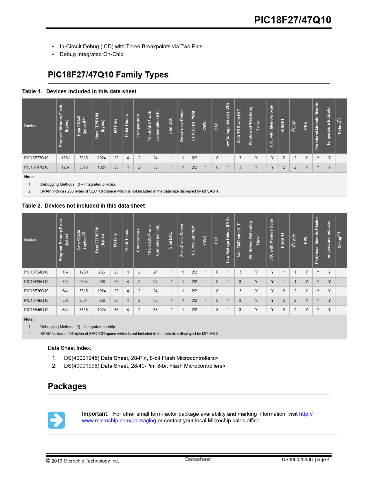 1. Debugging Methods: (I) – Integrated on-chip. 2. SRAM includes 256 bytes of SECTOR space which is not included in the data size displayed by MPLAB X.