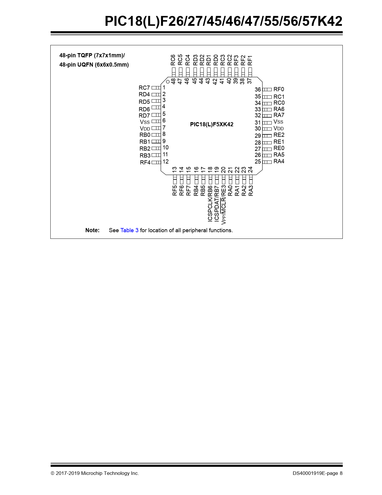 PIC18(L)F26/27/45/46/47/55/56/57K42. 48-pin TQFP (7x7x1mm)/. 48-pin UQFN (6x6x0.5mm). PIC18(L)F5XK42. Note: