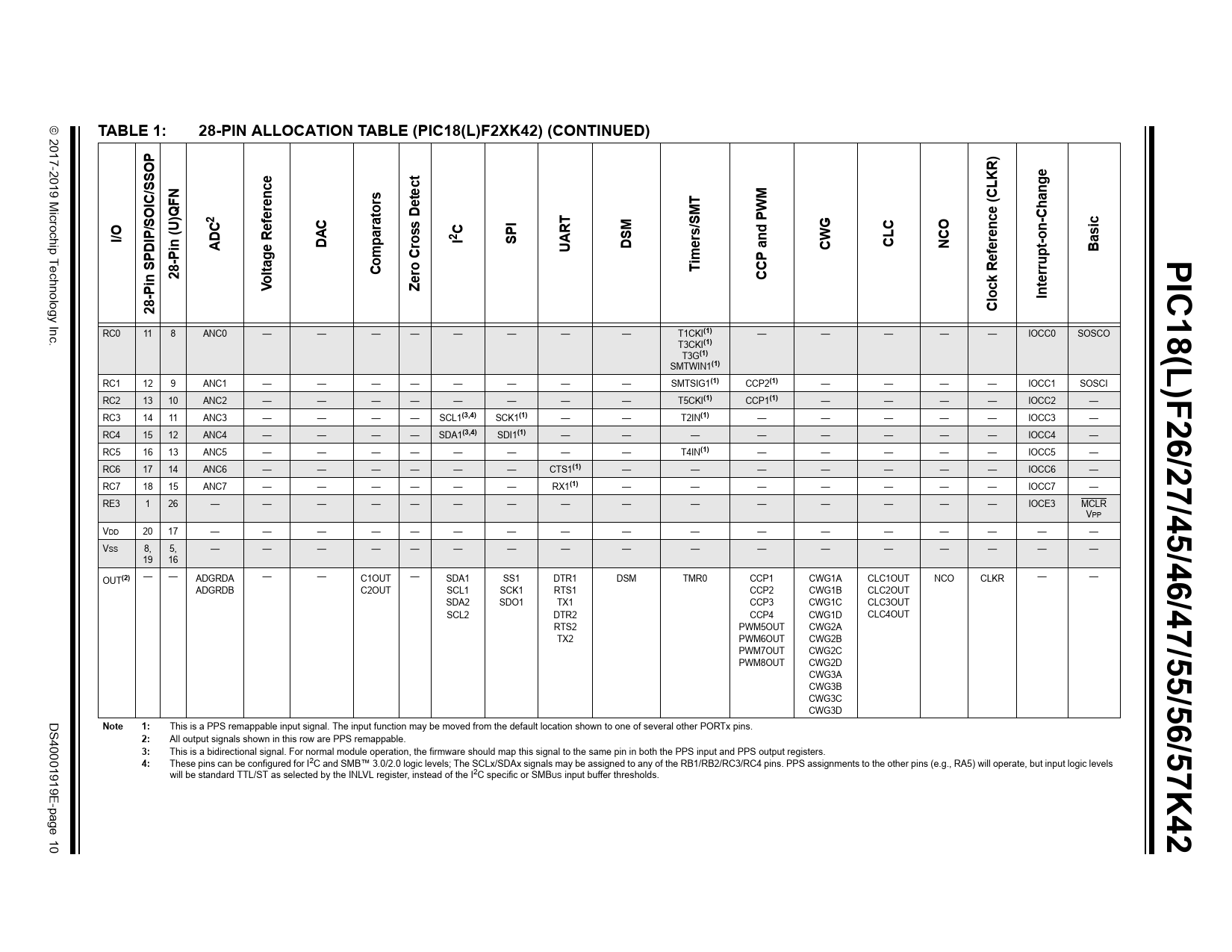 | Pages / Page | 833 / 10 — TABLE 1:. 28-PIN ALLOCATION TABLE (PIC18(L)F2XK42) (CONTINUED). (CLK. … |