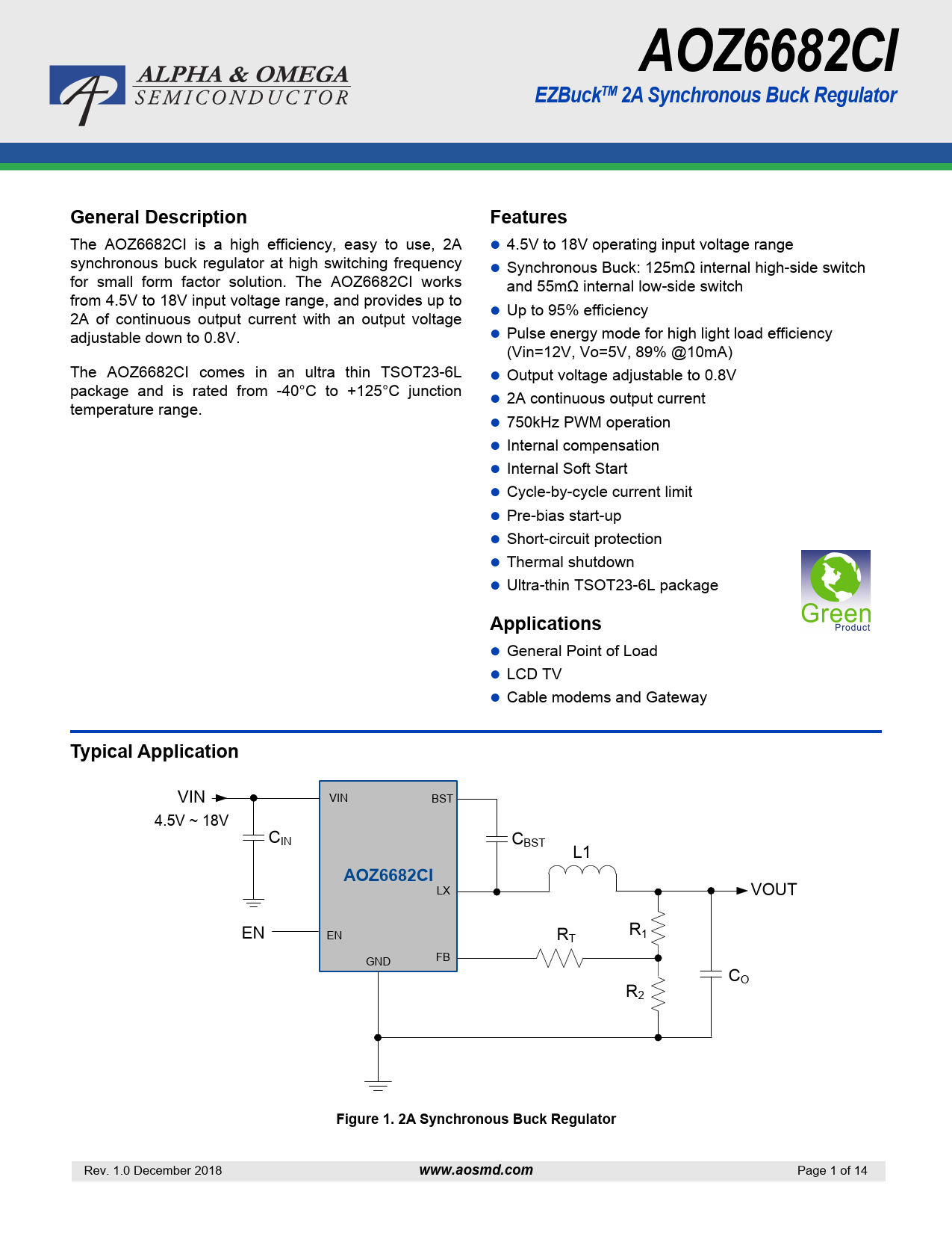 The AOZ6682CI is a high efficiency, easy to use, 2A 4.5V to 18V operating input voltage range synchronous buck regulator at high switching frequency Synchronous Buck: 125mΩ internal high-side switch for small form factor solution. The AOZ6682CI works and 55mΩ internal low-side switch from 4.5V to 18V input voltage range, and provides up to Up to 95% efficiency 2A of continuous output current with an output voltage adjustable down to 0.8V. Pulse energy mode for high light load efficiency (Vin=12V, Vo=5V, 89% @10mA) The AOZ6682CI comes in an ultra thin TSOT23-6L Output voltage adjustable to 0.8V package and is rated from -40°C to +125°C junction 2A continuous output current temperature range. 750kHz PWM operation Internal compensation Internal Soft Start Cycle-by-cycle current limit Pre-bias start-up Short-circuit protection Thermal shutdown Ultra-thin TSOT23-6L package