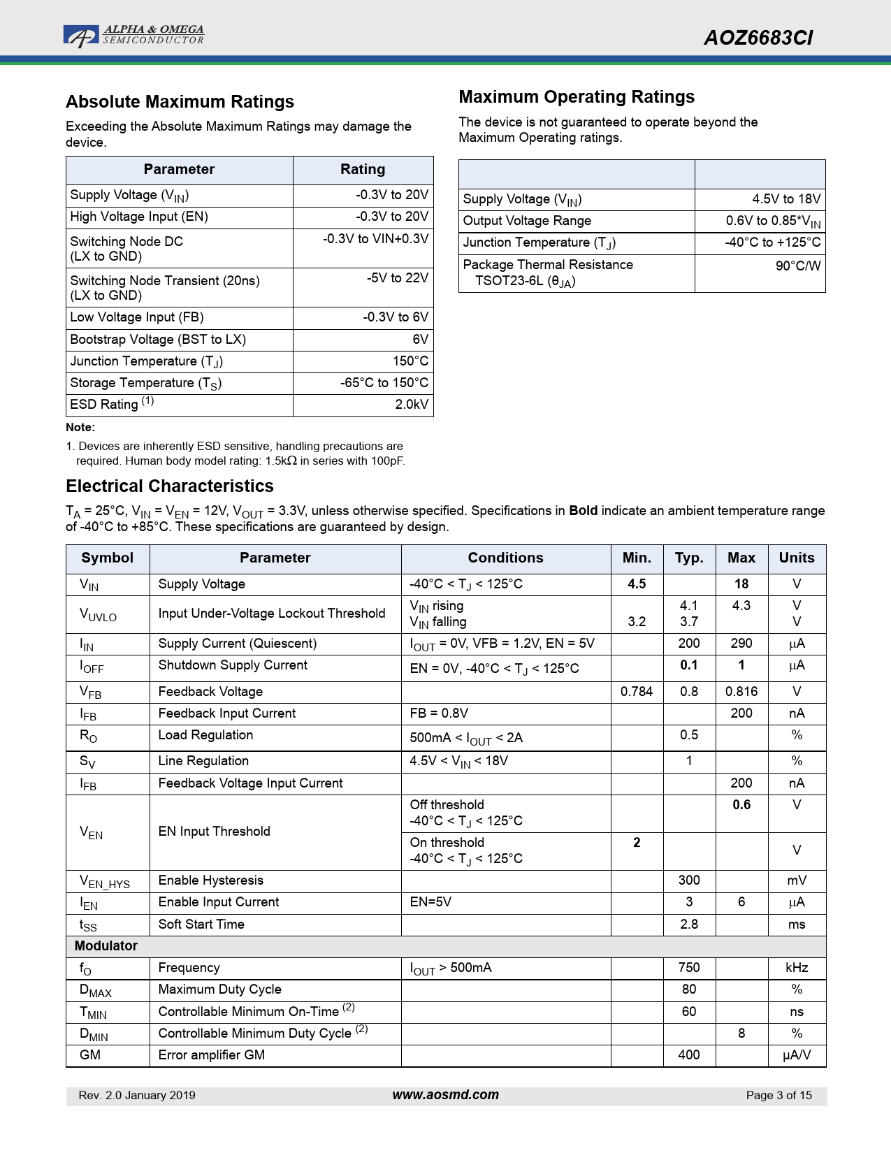 AOZ6683CI. Absolute Maximum Ratings. Maximum Operating Ratings. Parameter. Rating. Note:. Electrical Characteristics. Bold. Symbol