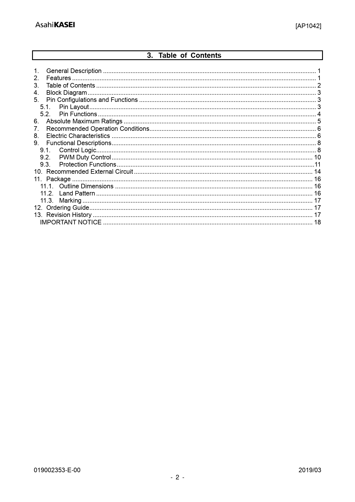 link to page 1 link to page 1 link to page 2 link to page 3 link to page 3 link to page 3 link to page 4 link to page 5 link to page 6 link to page 6 link to page 8 link to page 8 link to page 10 link to page 11 link to page 14 link to page 16 link to page 16 link to page 16 link to page 17 link to page 17 link to page 17 link to page 18 [AP1042] 3. Table of Contents 1. General Description .. 1 2. Features .. 1 3. Table of Contents .. 2 4. Block Diagram ... 3 5. Pin Configulations and Functions ... 3 5.1. Pin Layout .. 3 5.2. Pin Functions ... 4 6. Absolute Maximum Ratings .. 5 7. Recommended Operation Conditions ... 6 8. Electric Characteristics ... 6 9. Functional Descriptions ... 8 9.1. Control Logic .. 8 9.2. PWM Duty Control ... 10 9.3. Protection Functions ... 11 10. Recommended External Circuit .. 14 11. Package .. 16 11.1. Outline Dimensions ... 16 11.2. Land Pattern .. 16 11.3. Marking .. 17 12. Ordering Guide .. 17 13. Revision History .. 17 IMPORTANT NOTICE .. 18 019002353-E-00 2019/03 - 2 - Document Outline 1. General Description 2. Features 3. Table of Contents 4. Block Diagram 5. Pin Configulations and Functions 5.1. Pin Layout 5.2. Pin Functions 6. Absolute Maximum Ratings 7. Recommended Operation Conditions 8. Electric Characteristics 9. Functional Descriptions 9.1. Control Logic 9.2. PWM Duty Control 9.3. Protection Functions 10. Recommended External Circuit 11. Package 11.1. Outline Dimensions 11.2. Land Pattern 11.3. Marking 12. Ordering Guide 13. Revision History IMPORTANT NOTICE