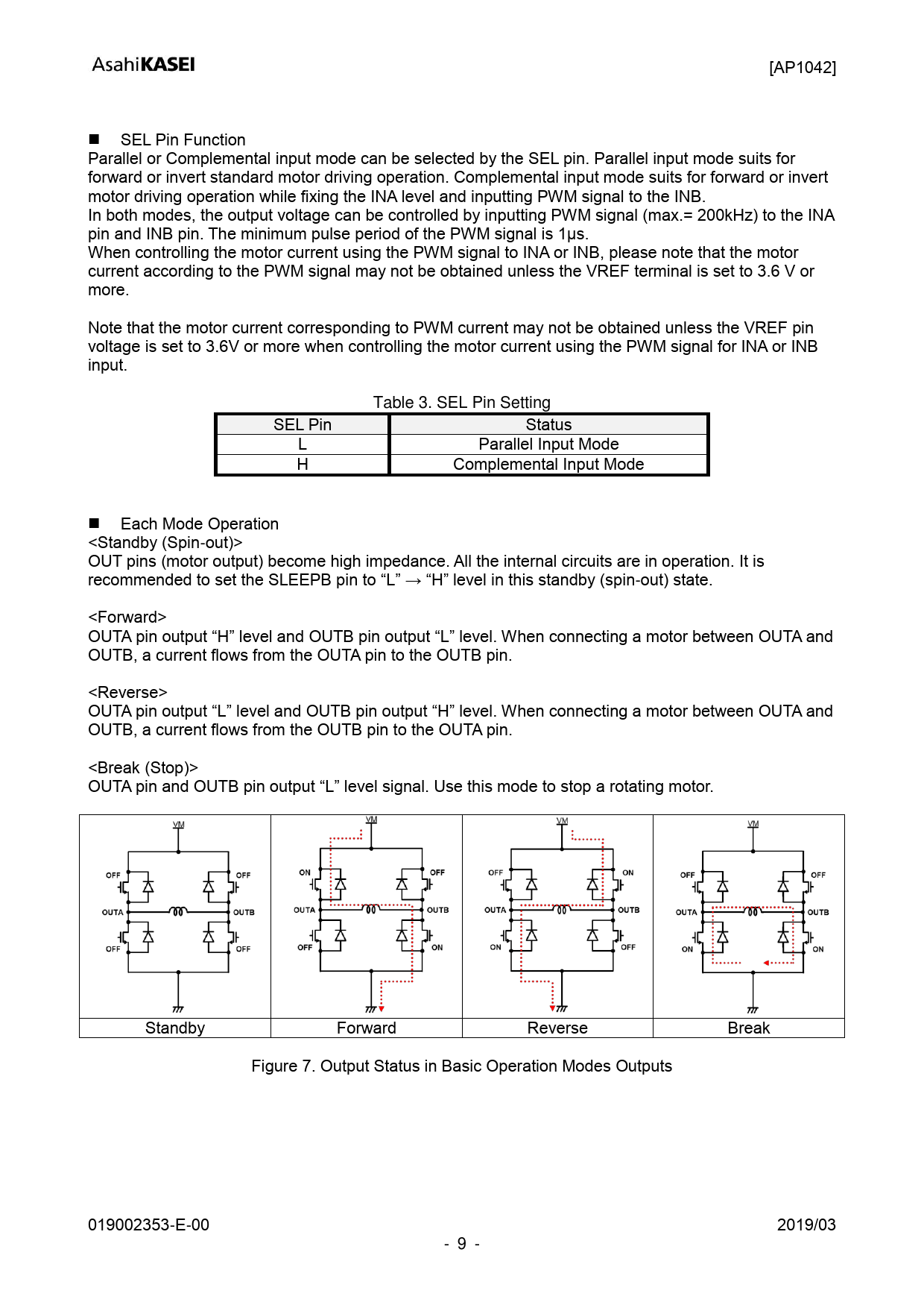 [AP1042] SEL Pin Function Parallel or Complemental input mode can be selected by the SEL pin. Parallel input mode suits for forward or invert standard motor driving operation. Complemental input mode suits for forward or invert motor driving operation while fixing the INA level and inputting PWM signal to the INB. In both modes, the output voltage can be controlled by inputting PWM signal (max.= 200kHz) to the INA pin and INB pin. The minimum pulse period of the PWM signal is 1μs. When controlling the motor current using the PWM signal to INA or INB, please note that the motor current according to the PWM signal may not be obtained unless the VREF terminal is set to 3.6 V or more. Note that the motor current corresponding to PWM current may not be obtained unless the VREF pin voltage is set to 3.6V or more when controlling the motor current using the PWM signal for INA or INB input. Table 3. SEL Pin Setting SEL Pin Status L Parallel Input Mode H Complemental Input Mode Each Mode Operation <Standby (Spin-out)> OUT pins (motor output) become high impedance. All the internal circuits are in operation. It is recommended to set the SLEEPB pin to “L” → “H” level in this standby (spin-out) state. <Forward> OUTA pin output “H” level and OUTB pin output “L” level. When connecting a motor between OUTA and OUTB, a current flows from the OUTA pin to the OUTB pin. <Reverse> OUTA pin output “L” level and OUTB pin output “H” level. When connecting a motor between OUTA and OUTB, a current flows from the OUTB pin to the OUTA pin. <Break (Stop)> OUTA pin and OUTB pin output “L” level signal. Use this mode to stop a rotating motor. Standby Forward Reverse Break Figure 7. Output Status in Basic Operation Modes Outputs 019002353-E-00 2019/03 - 9 - Document Outline 1. General Description 2. Features 3. Table of Contents 4. Block Diagram 5. Pin Configulations and Functions 5.1. Pin Layout 5.2. Pin Functions 6. Absolute Maximum Ratings 7. Recommended Operation Conditions 8. Electric Characteristics 9. Functional Descriptions 9.1. Control Logic 9.2. PWM Duty Control 9.3. Protection Functions 10. Recommended External Circuit 11. Package 11.1. Outline Dimensions 11.2. Land Pattern 11.3. Marking 12. Ordering Guide 13. Revision History IMPORTANT NOTICE
