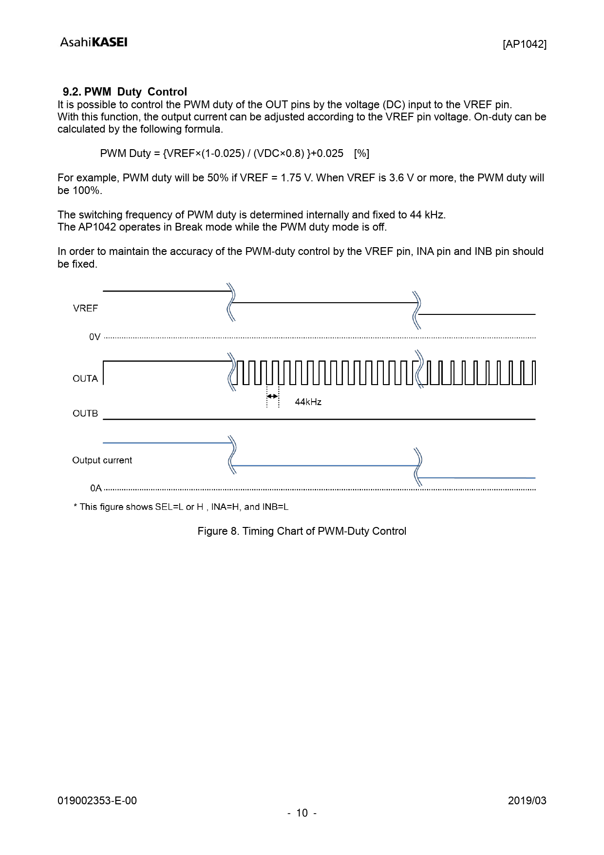 [AP1042] 9.2. PWM Duty Control It is possible to control the PWM duty of the OUT pins by the voltage (DC) input to the VREF pin. With this function, the output current can be adjusted according to the VREF pin voltage. On-duty can be calculated by the following formula. PWM Duty = {VREF×(1-0.025) / (VDC×0.8) }+0.025 [%] For example, PWM duty will be 50% if VREF = 1.75 V. When VREF is 3.6 V or more, the PWM duty will be 100%. The switching frequency of PWM duty is determined internally and fixed to 44 kHz. The AP1042 operates in Break mode while the PWM duty mode is off. In order to maintain the accuracy of the PWM-duty control by the VREF pin, INA pin and INB pin should be fixed. Figure 8. Timing Chart of PWM-Duty Control 019002353-E-00 2019/03 - 10 - Document Outline 1. General Description 2. Features 3. Table of Contents 4. Block Diagram 5. Pin Configulations and Functions 5.1. Pin Layout 5.2. Pin Functions 6. Absolute Maximum Ratings 7. Recommended Operation Conditions 8. Electric Characteristics 9. Functional Descriptions 9.1. Control Logic 9.2. PWM Duty Control 9.3. Protection Functions 10. Recommended External Circuit 11. Package 11.1. Outline Dimensions 11.2. Land Pattern 11.3. Marking 12. Ordering Guide 13. Revision History IMPORTANT NOTICE