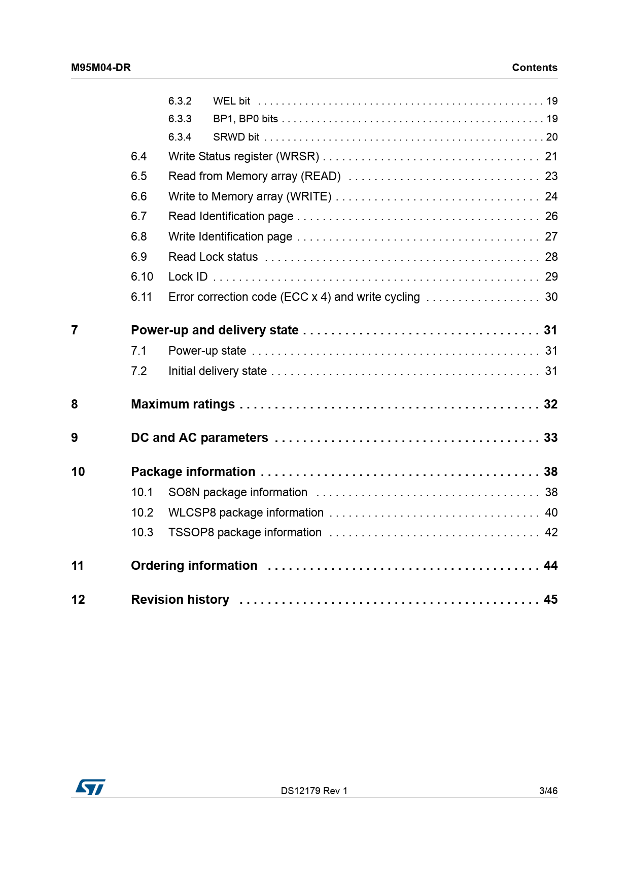 Pages / Page46 / 3 — M95M04-DR. Contents. Power-up and delivery state . 31. Maximum ratings . …