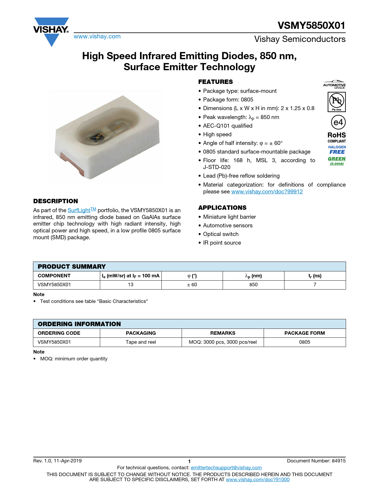 VSMY5850X01 Tape and reel MOQ: 3000 pcs, 3000 pcs/reel 0805