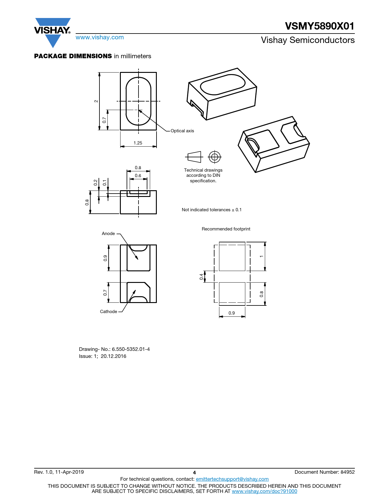 in millimeters 2 0.7 Optical axis 1.25 0.8 Technical drawings 0.6 according to DIN specification. 0.2 0.1 0.8 Not indicated tolerances ± 0.1 Recommended footprint Anode 1 0.9 0.4 0.7 0.8 Cathode 0.9 Drawing- No.: 6.550-5352.01-4 Issue: 1; 20.12.2016 Rev. 1.0, 11-Apr-2019