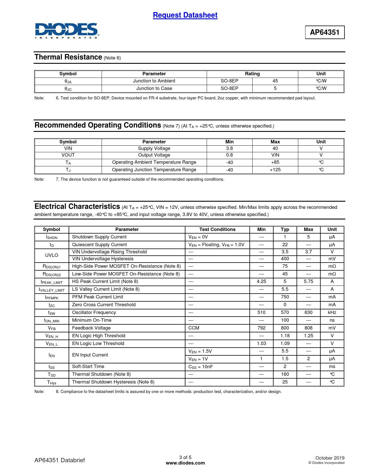 Request Datasheet. AP64351. Thermal Resistance. Symbol. Parameter. Rating. Unit. Recommended Operating Conditions. Min. Max
