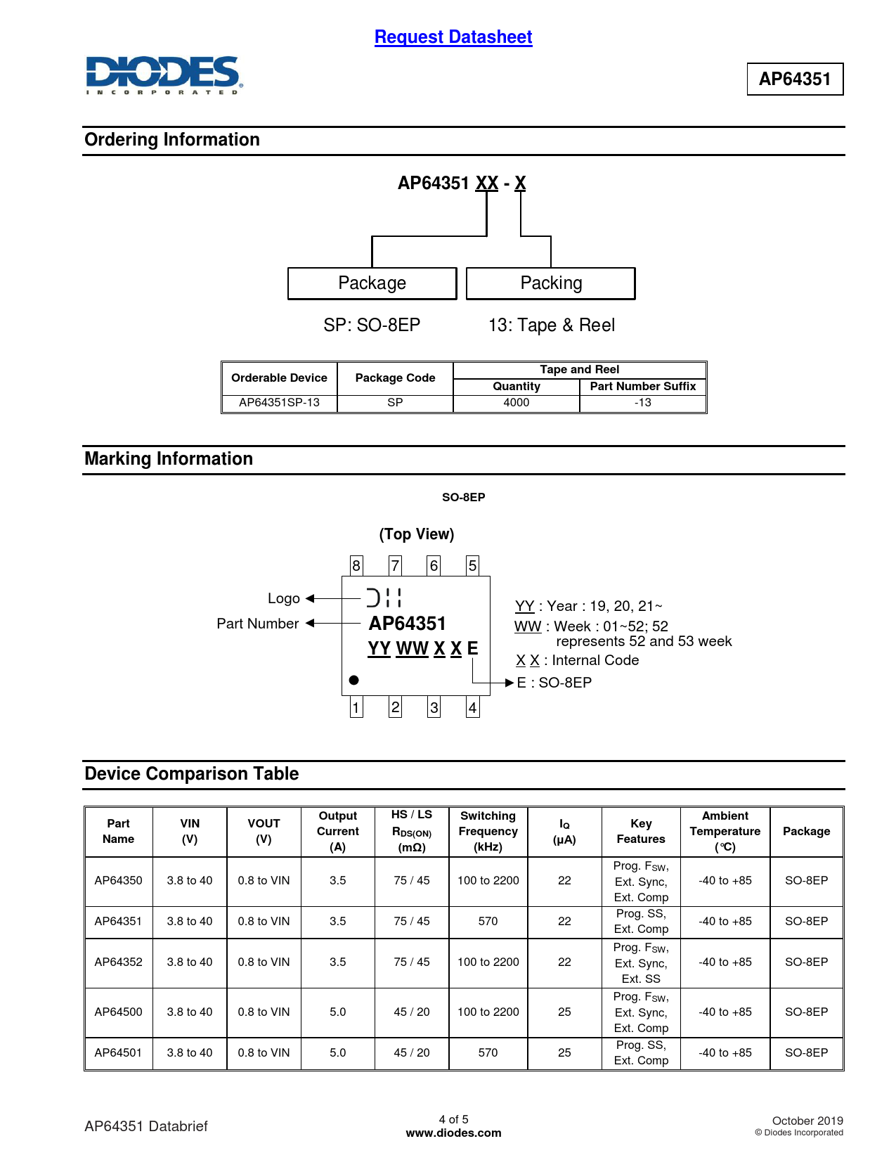 | Pages / Page | 5 / 4 — Request Datasheet. AP64351. Ordering Information. AP64351 XX - X. Tape … |